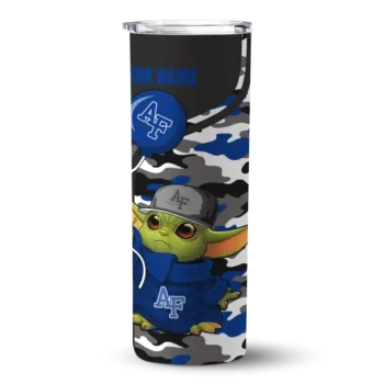 The Customized Air Force Falcons Yoda Camo Blue Black Skinny Tumbler tumbler is the perfect way to stay refreshed while showing off your pride for Air Force Falcons. With its double-wall insulation, your drinks stay at the right temperature for hours, whether you're enjoying a hot coffee or keeping your iced drink cold. What's inside? You’ll find 1 stainless steel tumbler, 1 clear lid, and 1 removable straw. It's the perfect blend of function and fan spirit! Ergonomically designed for comfort, made from durable stainless steel, and insulated to maintain your drink’s temperature, this tumbler is a must-have for any dedicated NCAA fan.