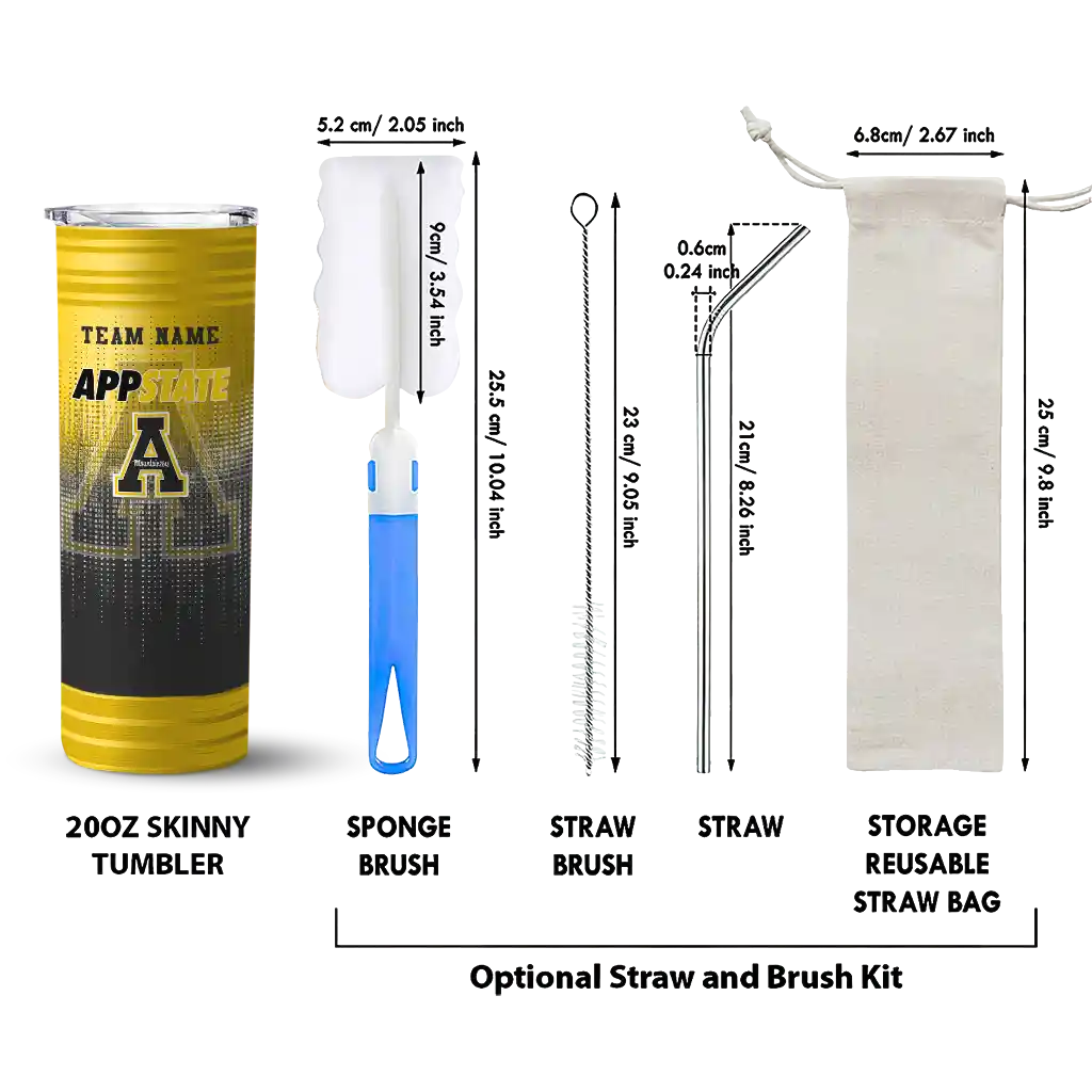 The Custom Appalachian State Mountaineers Camo Streak Black Skinny Tumbler tumbler is the perfect way to stay refreshed while showing off your pride for Appalachian State Mountaineers. With its double-wall insulation, your drinks stay at the right temperature for hours, whether you're enjoying a hot coffee or keeping your iced drink cold. What's inside? You’ll find 1 stainless steel tumbler, 1 clear lid, and 1 removable straw. It's the perfect blend of function and fan spirit! Ergonomically designed for comfort, made from durable stainless steel, and insulated to maintain your drink’s temperature, this tumbler is a must-have for any dedicated NCAA fan.