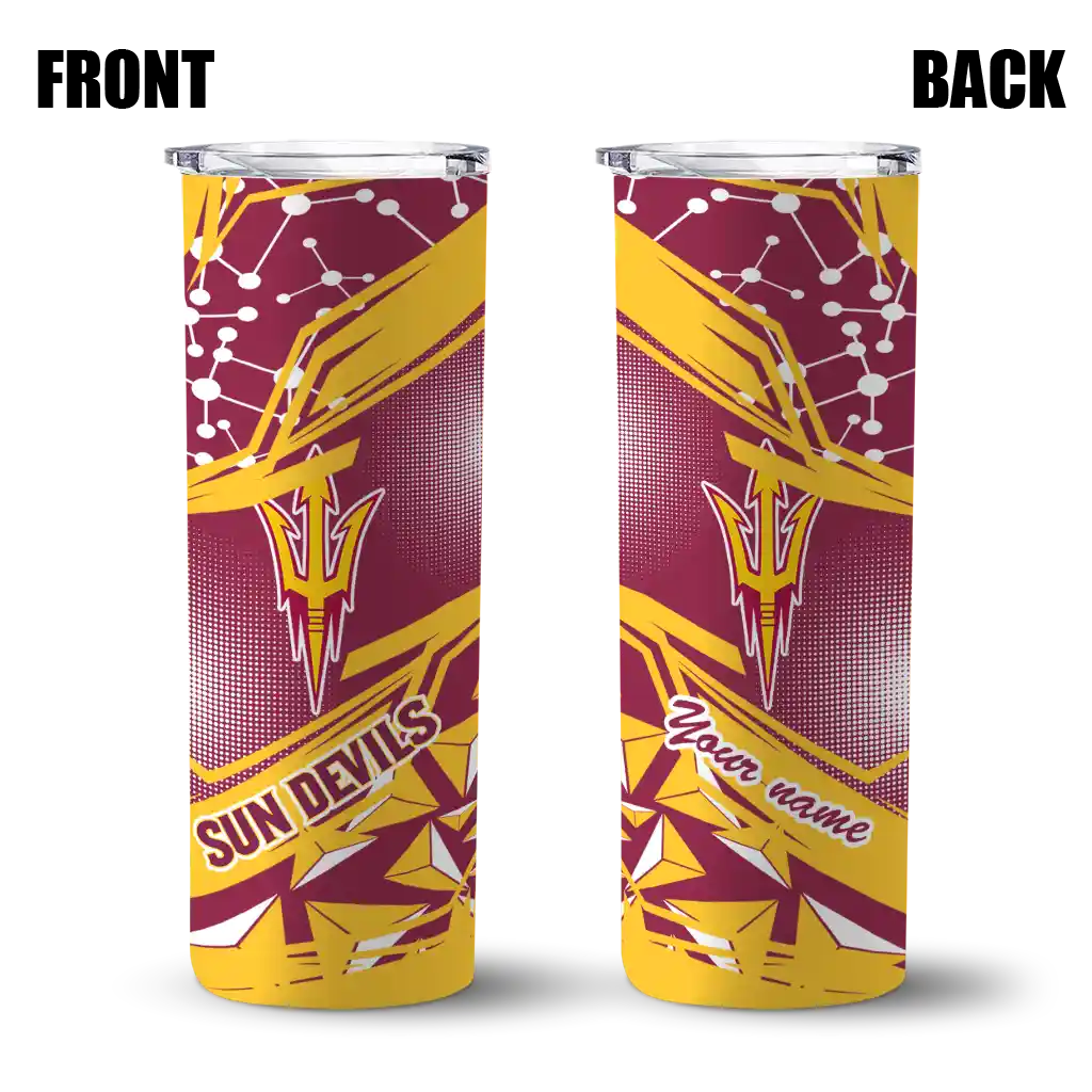 The Personalized Arizona State Sun Devils Swirl Texture Maroon Skinny Tumbler tumbler is the perfect way to stay refreshed while showing off your pride for Arizona State Sun Devils. With its double-wall insulation, your drinks stay at the right temperature for hours, whether you're enjoying a hot coffee or keeping your iced drink cold. What's inside? You’ll find 1 stainless steel tumbler, 1 clear lid, and 1 removable straw. It's the perfect blend of function and fan spirit! Ergonomically designed for comfort, made from durable stainless steel, and insulated to maintain your drink’s temperature, this tumbler is a must-have for any dedicated NCAA fan.
