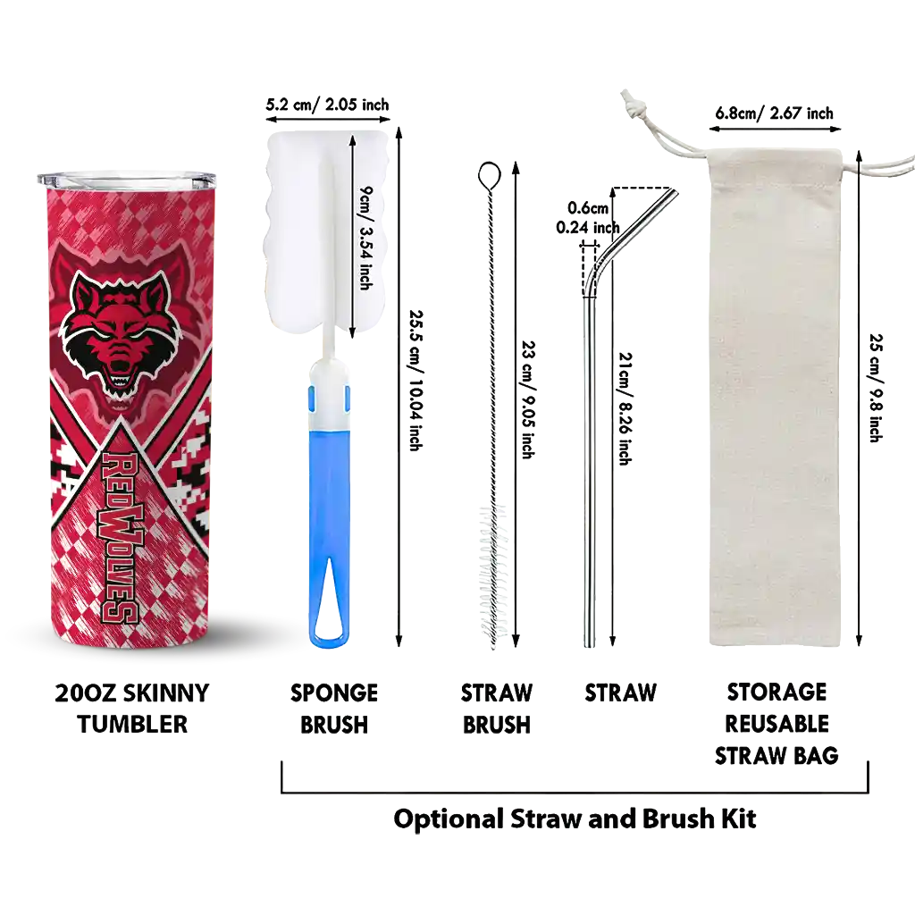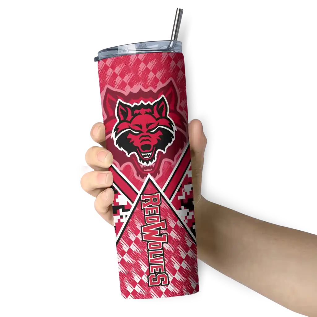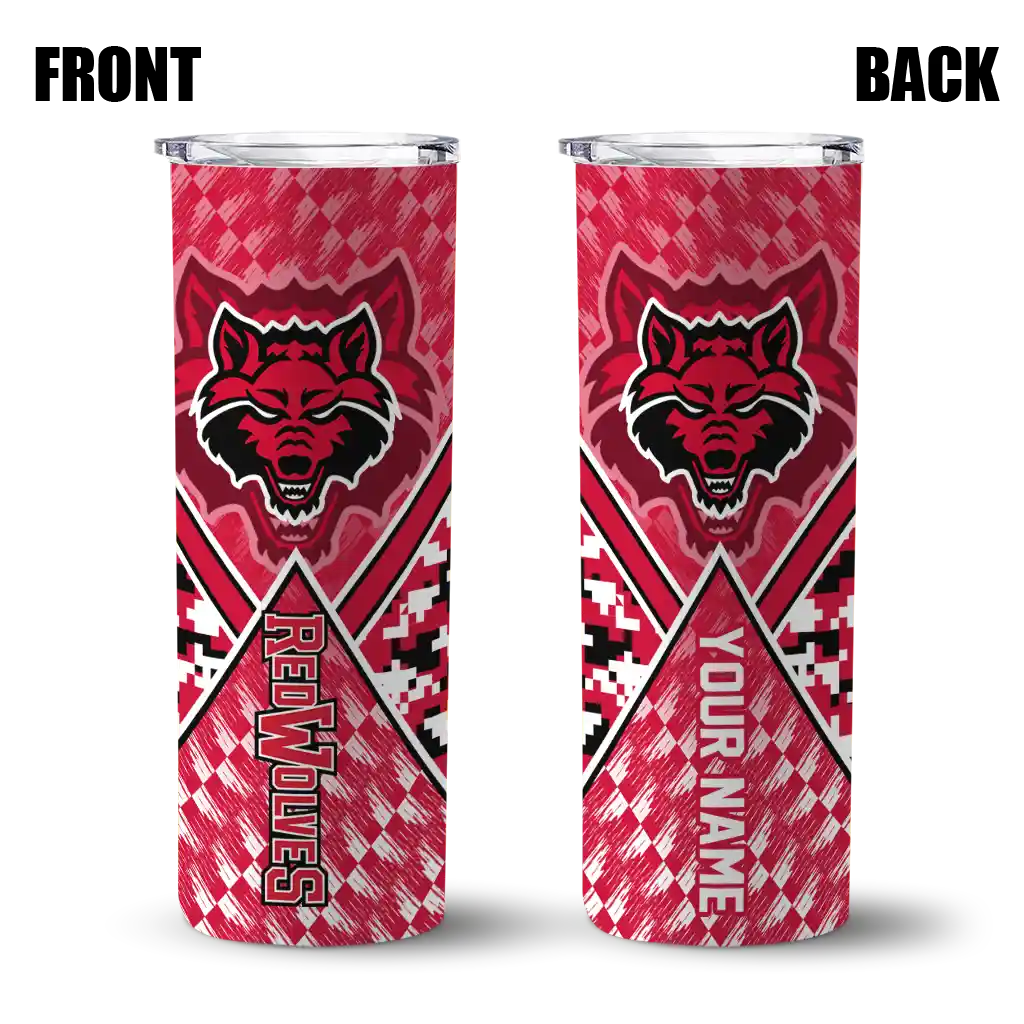 The Custom Arkansas State Red Wolves Chevron Patch Scarlet Skinny Tumbler tumbler is the perfect way to stay refreshed while showing off your pride for Arkansas State Red Wolves. With its double-wall insulation, your drinks stay at the right temperature for hours, whether you're enjoying a hot coffee or keeping your iced drink cold. What's inside? You’ll find 1 stainless steel tumbler, 1 clear lid, and 1 removable straw. It's the perfect blend of function and fan spirit! Ergonomically designed for comfort, made from durable stainless steel, and insulated to maintain your drink’s temperature, this tumbler is a must-have for any dedicated NCAA fan.