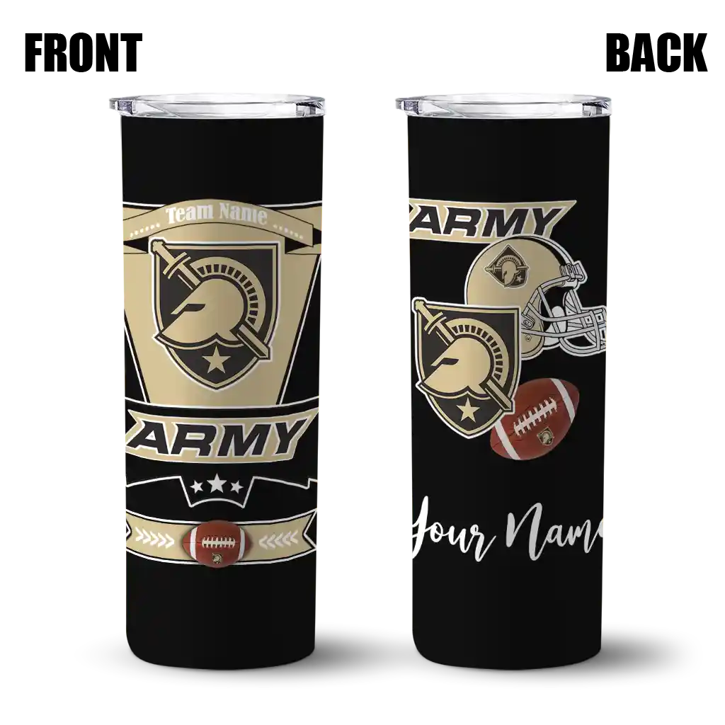 The Custom Army Black Knights Helmet Belt Gold Black Skinny Tumbler tumbler is the perfect way to stay refreshed while showing off your pride for Army Black Knights. With its double-wall insulation, your drinks stay at the right temperature for hours, whether you're enjoying a hot coffee or keeping your iced drink cold. What's inside? You’ll find 1 stainless steel tumbler, 1 clear lid, and 1 removable straw. It's the perfect blend of function and fan spirit! Ergonomically designed for comfort, made from durable stainless steel, and insulated to maintain your drink’s temperature, this tumbler is a must-have for any dedicated NCAA fan.