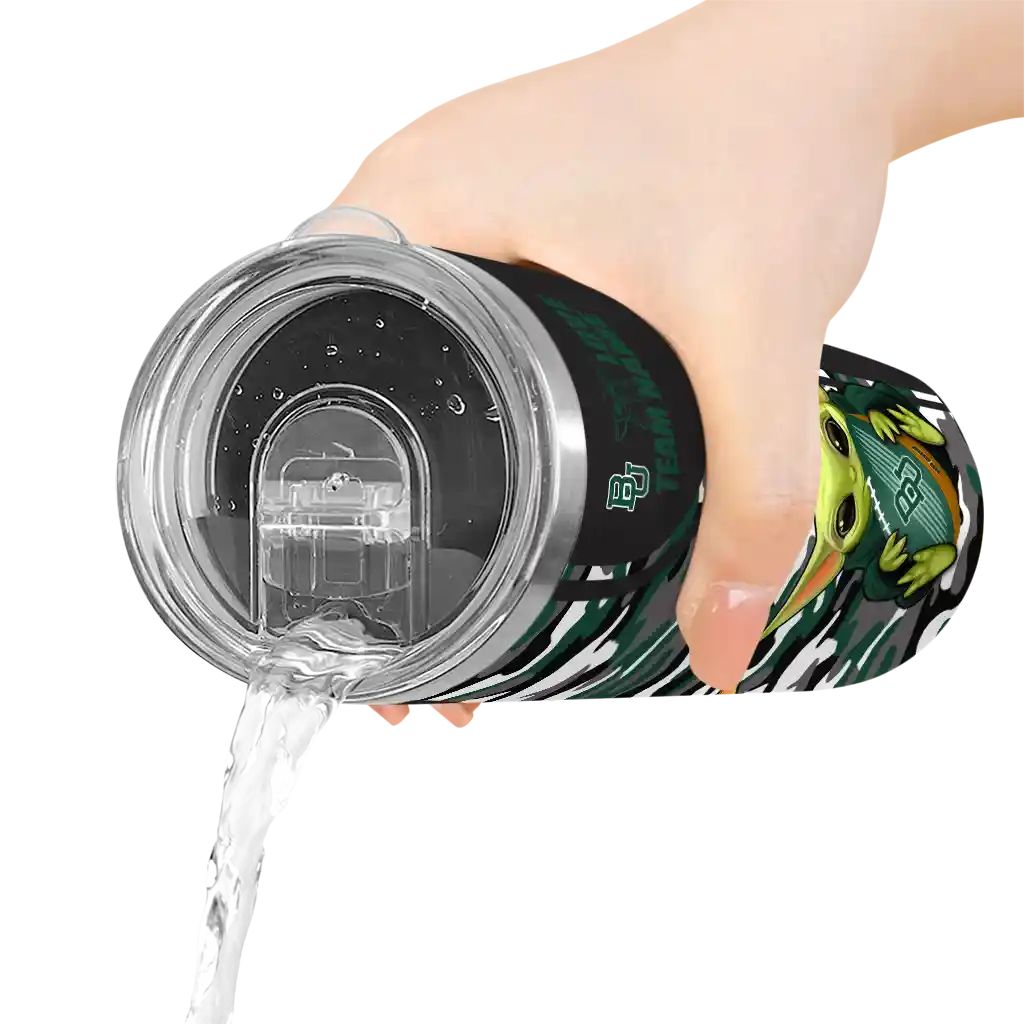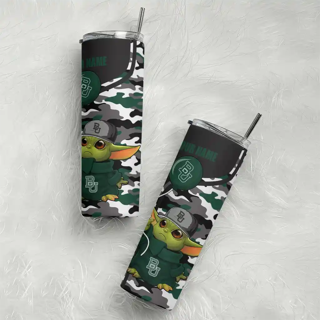 The Custom Baylor Bears Yoda Camo Green Black Skinny Tumbler tumbler is the perfect way to stay refreshed while showing off your pride for Baylor Bears. With its double-wall insulation, your drinks stay at the right temperature for hours, whether you're enjoying a hot coffee or keeping your iced drink cold. What's inside? You’ll find 1 stainless steel tumbler, 1 clear lid, and 1 removable straw. It's the perfect blend of function and fan spirit! Ergonomically designed for comfort, made from durable stainless steel, and insulated to maintain your drink’s temperature, this tumbler is a must-have for any dedicated NCAA fan.