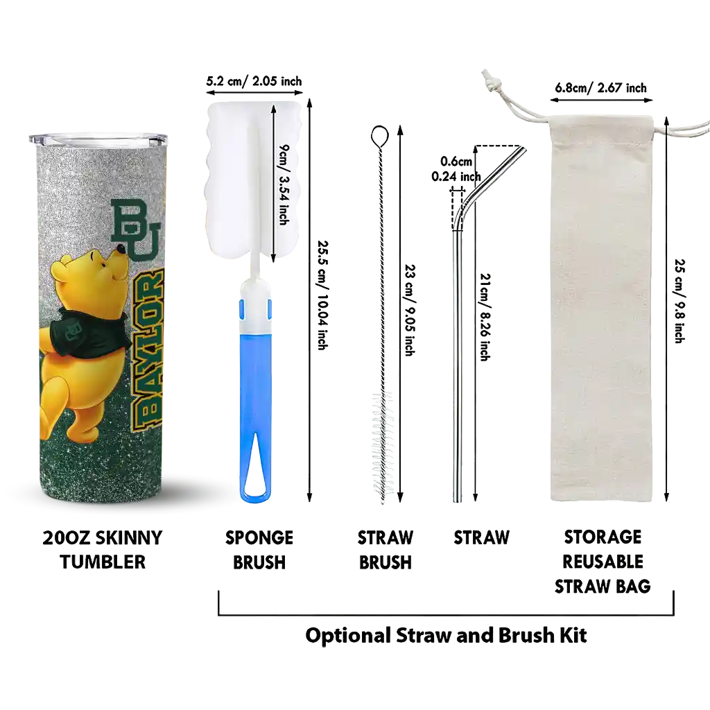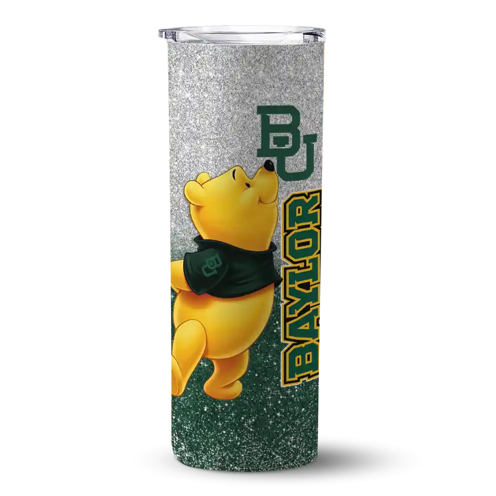 The Personalized Baylor Bears Winnie the Pooh Green Gray Skinny Tumbler tumbler is the perfect way to stay refreshed while showing off your pride for Baylor Bears. With its double-wall insulation, your drinks stay at the right temperature for hours, whether you're enjoying a hot coffee or keeping your iced drink cold. What's inside? You’ll find 1 stainless steel tumbler, 1 clear lid, and 1 removable straw. It's the perfect blend of function and fan spirit! Ergonomically designed for comfort, made from durable stainless steel, and insulated to maintain your drink’s temperature, this tumbler is a must-have for any dedicated NCAA fan.