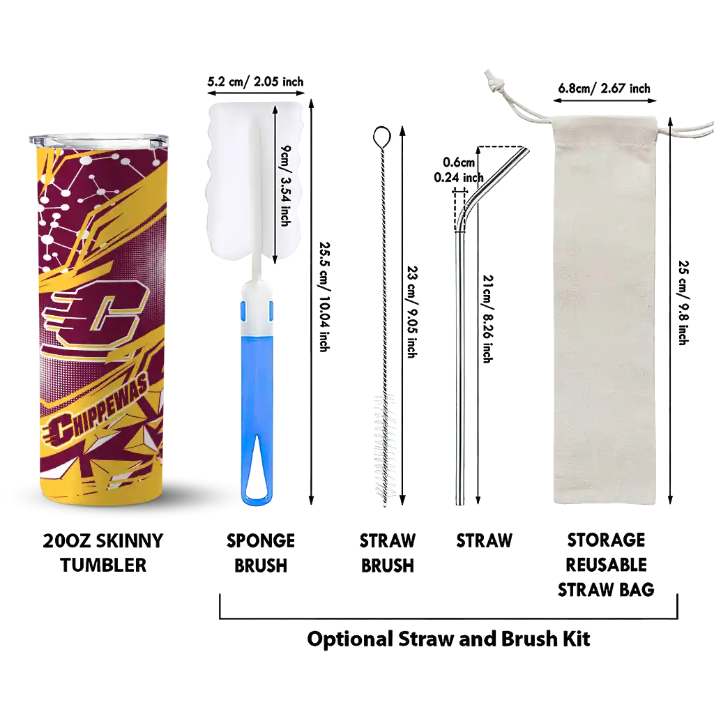 The Custom Central Michigan Chippewas Helmet Clash Maroon Skinny Tumbler tumbler is the perfect way to stay refreshed while showing off your pride for Central Michigan Chippewas. With its double-wall insulation, your drinks stay at the right temperature for hours, whether you're enjoying a hot coffee or keeping your iced drink cold. What's inside? You’ll find 1 stainless steel tumbler, 1 clear lid, and 1 removable straw. It's the perfect blend of function and fan spirit! Ergonomically designed for comfort, made from durable stainless steel, and insulated to maintain your drink’s temperature, this tumbler is a must-have for any dedicated NCAA fan.