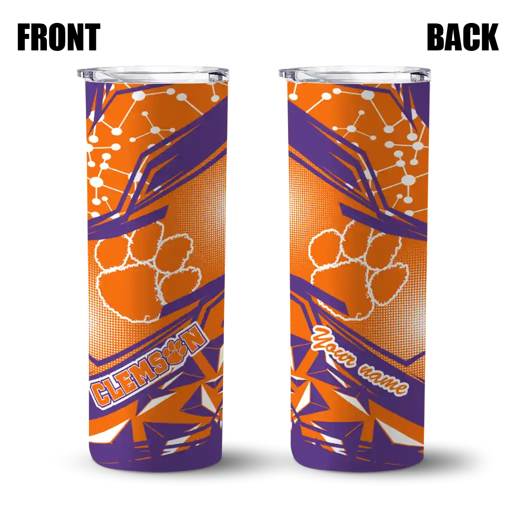 The Customized Clemson Tigers Star Pop Orange Black Skinny Tumbler tumbler is the perfect way to stay refreshed while showing off your pride for Clemson Tigers. With its double-wall insulation, your drinks stay at the right temperature for hours, whether you're enjoying a hot coffee or keeping your iced drink cold. What's inside? You’ll find 1 stainless steel tumbler, 1 clear lid, and 1 removable straw. It's the perfect blend of function and fan spirit! Ergonomically designed for comfort, made from durable stainless steel, and insulated to maintain your drink’s temperature, this tumbler is a must-have for any dedicated NCAA fan.