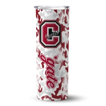 The Personalized Colgate Raiders Camo Streak Maroon Skinny Tumbler tumbler is the perfect way to stay refreshed while showing off your pride for Colgate Raiders. With its double-wall insulation, your drinks stay at the right temperature for hours, whether you're enjoying a hot coffee or keeping your iced drink cold. What's inside? You’ll find 1 stainless steel tumbler, 1 clear lid, and 1 removable straw. It's the perfect blend of function and fan spirit! Ergonomically designed for comfort, made from durable stainless steel, and insulated to maintain your drink’s temperature, this tumbler is a must-have for any dedicated NCAA fan.