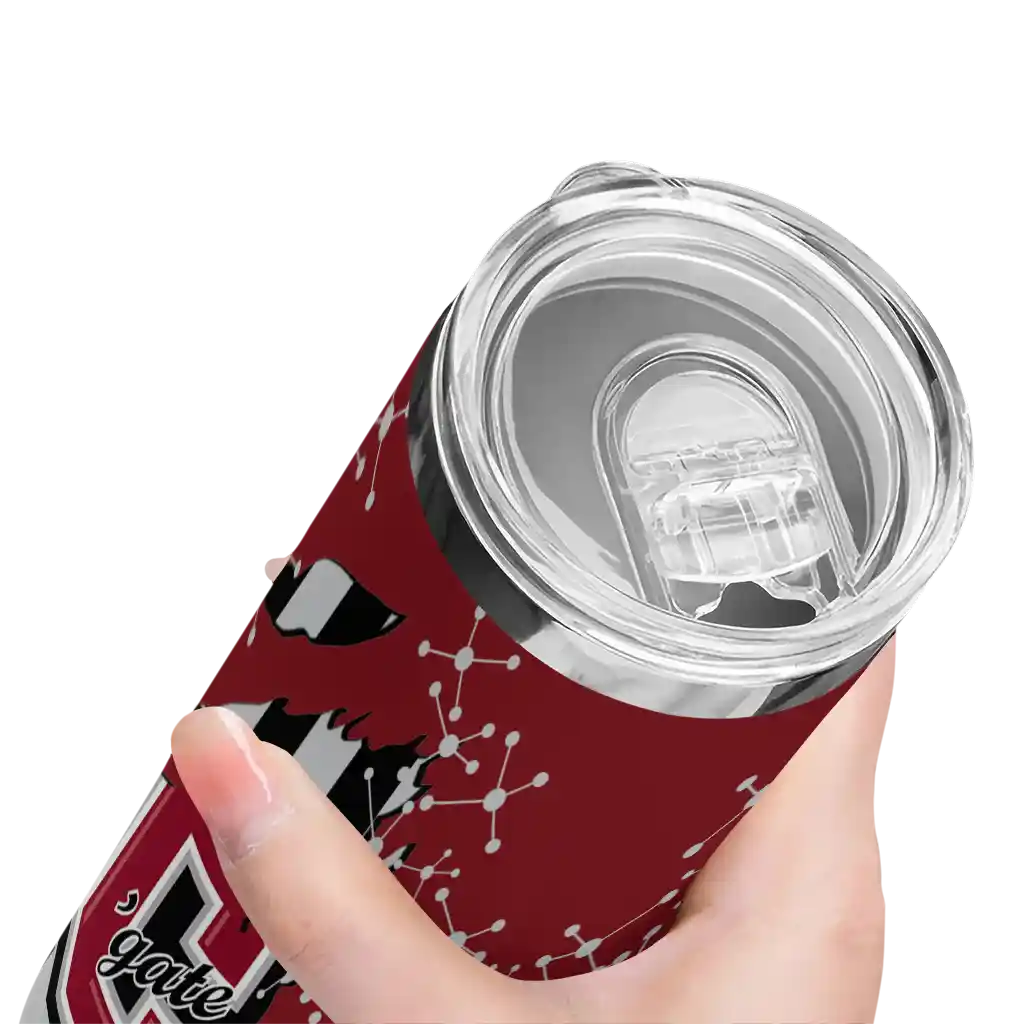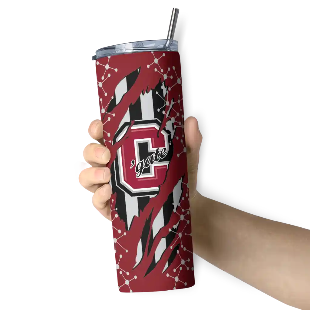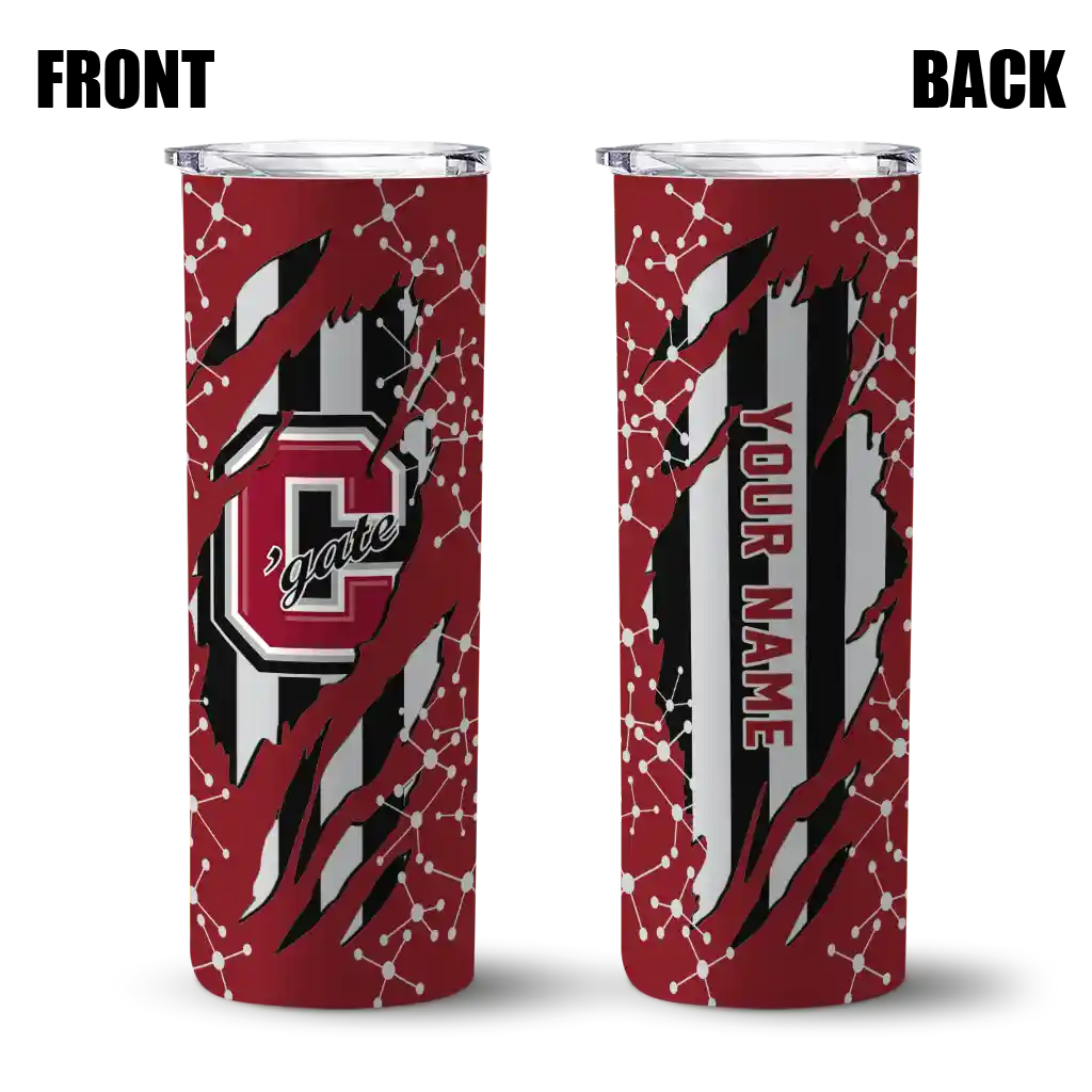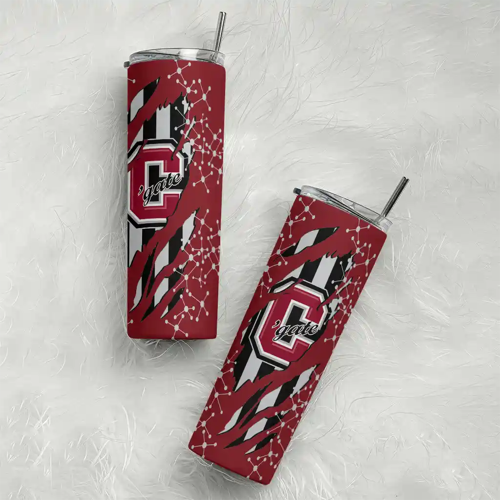 The Custom Colgate Raiders Monogram Burst Maroon White Skinny Tumbler tumbler is the perfect way to stay refreshed while showing off your pride for Colgate Raiders. With its double-wall insulation, your drinks stay at the right temperature for hours, whether you're enjoying a hot coffee or keeping your iced drink cold. What's inside? You’ll find 1 stainless steel tumbler, 1 clear lid, and 1 removable straw. It's the perfect blend of function and fan spirit! Ergonomically designed for comfort, made from durable stainless steel, and insulated to maintain your drink’s temperature, this tumbler is a must-have for any dedicated NCAA fan.