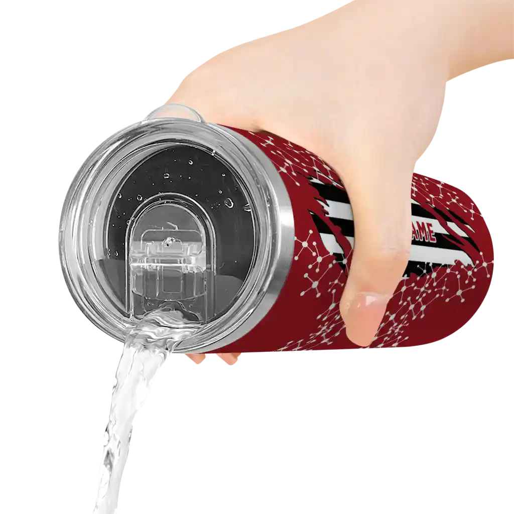 The Custom Colgate Raiders Star Pop Maroon Black Skinny Tumbler tumbler is the perfect way to stay refreshed while showing off your pride for Colgate Raiders. With its double-wall insulation, your drinks stay at the right temperature for hours, whether you're enjoying a hot coffee or keeping your iced drink cold. What's inside? You’ll find 1 stainless steel tumbler, 1 clear lid, and 1 removable straw. It's the perfect blend of function and fan spirit! Ergonomically designed for comfort, made from durable stainless steel, and insulated to maintain your drink’s temperature, this tumbler is a must-have for any dedicated NCAA fan.