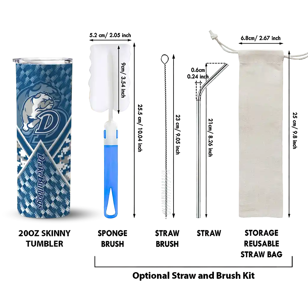 The Personalized Drake Bulldogs Helmet Belt Blue Black Skinny Tumbler tumbler is the perfect way to stay refreshed while showing off your pride for Drake Bulldogs. With its double-wall insulation, your drinks stay at the right temperature for hours, whether you're enjoying a hot coffee or keeping your iced drink cold. What's inside? You’ll find 1 stainless steel tumbler, 1 clear lid, and 1 removable straw. It's the perfect blend of function and fan spirit! Ergonomically designed for comfort, made from durable stainless steel, and insulated to maintain your drink’s temperature, this tumbler is a must-have for any dedicated NCAA fan.