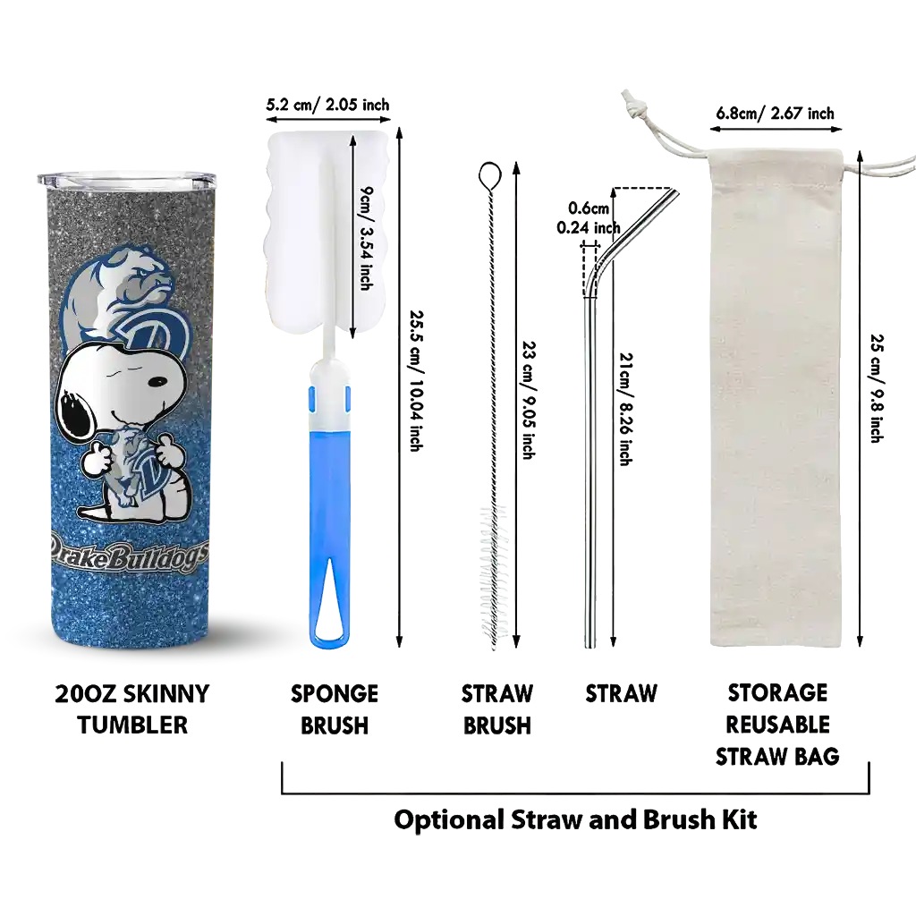 The Personalized Drake Bulldogs Snoopy Attitude Blue Skinny Tumbler tumbler is the perfect way to stay refreshed while showing off your pride for Drake Bulldogs. With its double-wall insulation, your drinks stay at the right temperature for hours, whether you're enjoying a hot coffee or keeping your iced drink cold. What's inside? You’ll find 1 stainless steel tumbler, 1 clear lid, and 1 removable straw. It's the perfect blend of function and fan spirit! Ergonomically designed for comfort, made from durable stainless steel, and insulated to maintain your drink’s temperature, this tumbler is a must-have for any dedicated NCAA fan.