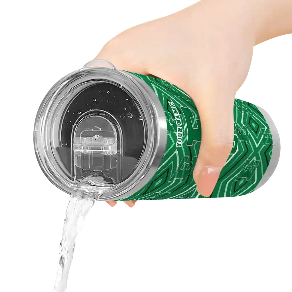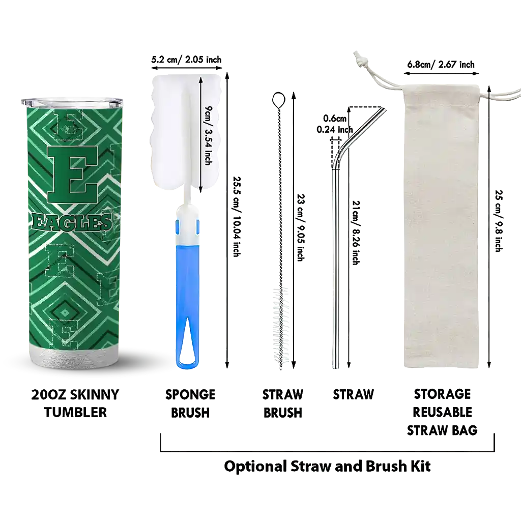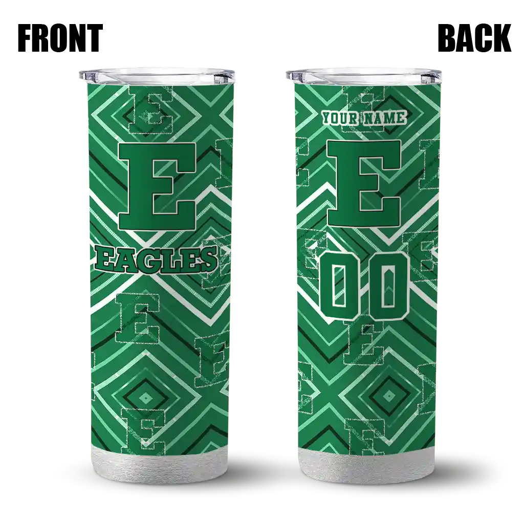 The Custom Eastern Michigan Eagles Chevron Patch Green Skinny Tumbler tumbler is the perfect way to stay refreshed while showing off your pride for Eastern Michigan Eagles. With its double-wall insulation, your drinks stay at the right temperature for hours, whether you're enjoying a hot coffee or keeping your iced drink cold. What's inside? You’ll find 1 stainless steel tumbler, 1 clear lid, and 1 removable straw. It's the perfect blend of function and fan spirit! Ergonomically designed for comfort, made from durable stainless steel, and insulated to maintain your drink’s temperature, this tumbler is a must-have for any dedicated NCAA fan.