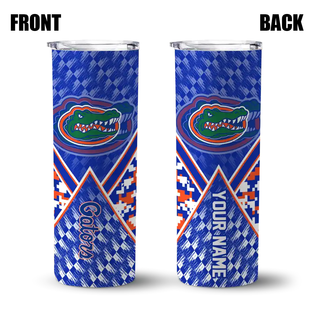 The Customized Florida Gators Camo Streak Blue Skinny Tumbler tumbler is the perfect way to stay refreshed while showing off your pride for Florida Gators. With its double-wall insulation, your drinks stay at the right temperature for hours, whether you're enjoying a hot coffee or keeping your iced drink cold. What's inside? You’ll find 1 stainless steel tumbler, 1 clear lid, and 1 removable straw. It's the perfect blend of function and fan spirit! Ergonomically designed for comfort, made from durable stainless steel, and insulated to maintain your drink’s temperature, this tumbler is a must-have for any dedicated NCAA fan.