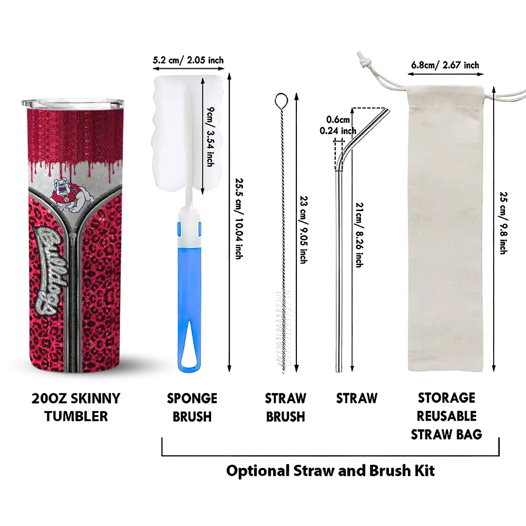 The Customized Fresno State Bulldogs Sparkle Drip Red Skinny Tumbler tumbler is the perfect way to stay refreshed while showing off your pride for Fresno State Bulldogs. With its double-wall insulation, your drinks stay at the right temperature for hours, whether you're enjoying a hot coffee or keeping your iced drink cold. What's inside? You’ll find 1 stainless steel tumbler, 1 clear lid, and 1 removable straw. It's the perfect blend of function and fan spirit! Ergonomically designed for comfort, made from durable stainless steel, and insulated to maintain your drink’s temperature, this tumbler is a must-have for any dedicated NCAA fan.