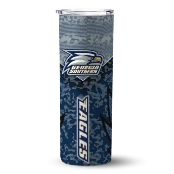 The Custom Georgia Southern Eagles Camo Streak Blue Skinny Tumbler tumbler is the perfect way to stay refreshed while showing off your pride for Georgia Southern Eagles. With its double-wall insulation, your drinks stay at the right temperature for hours, whether you're enjoying a hot coffee or keeping your iced drink cold. What's inside? You’ll find 1 stainless steel tumbler, 1 clear lid, and 1 removable straw. It's the perfect blend of function and fan spirit! Ergonomically designed for comfort, made from durable stainless steel, and insulated to maintain your drink’s temperature, this tumbler is a must-have for any dedicated NCAA fan.