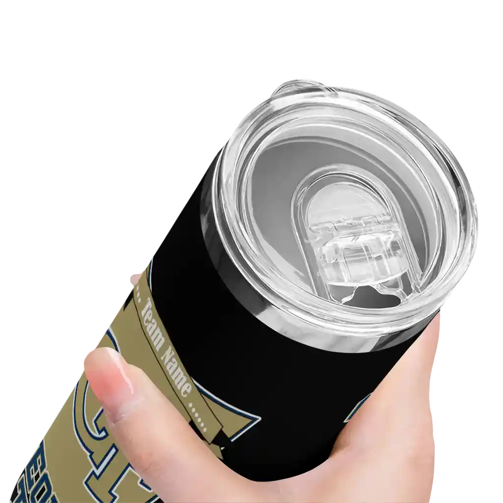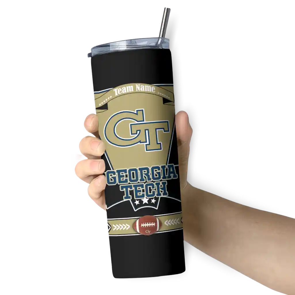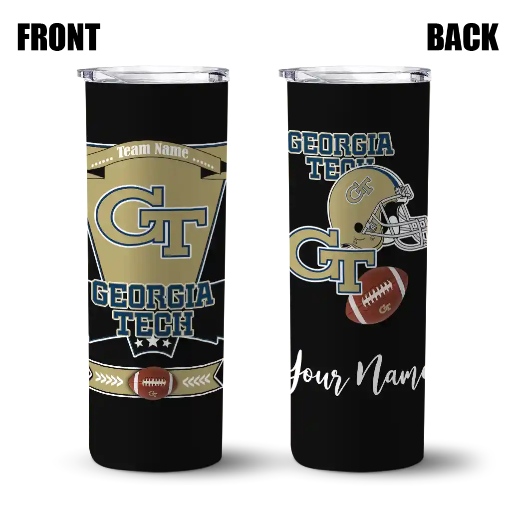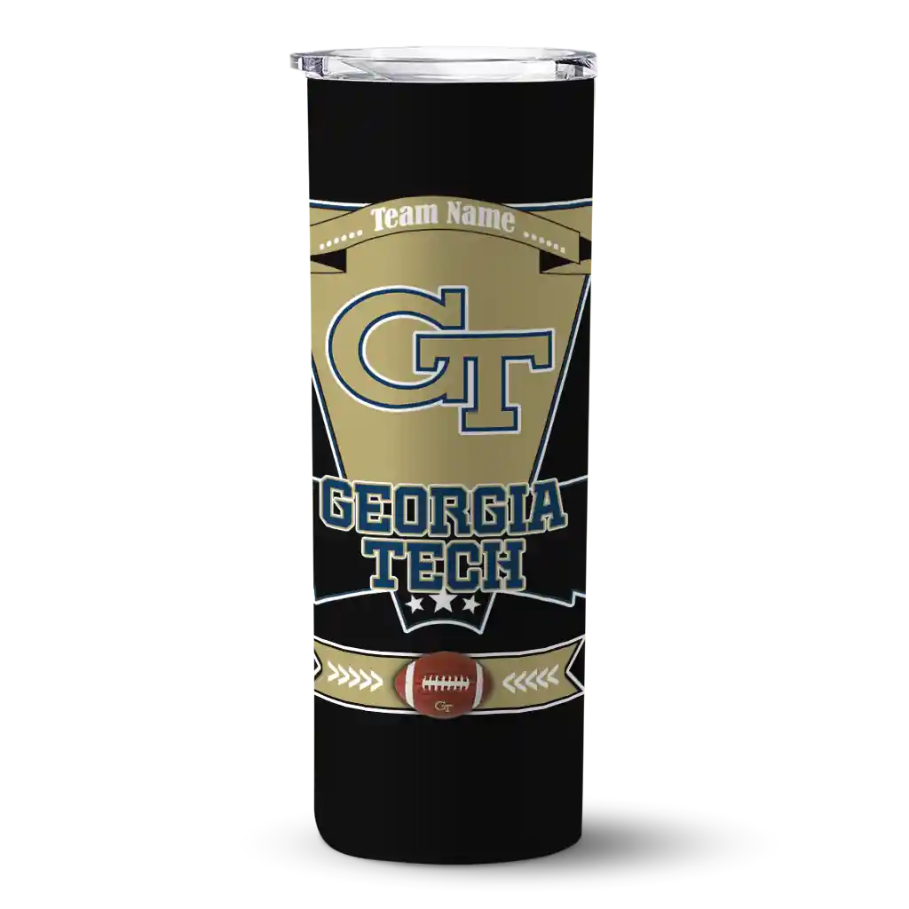 The Custom Georgia Tech Yellow Jackets Helmet Belt Gold Black Skinny Tumbler tumbler is the perfect way to stay refreshed while showing off your pride for Georgia Tech Yellow Jackets. With its double-wall insulation, your drinks stay at the right temperature for hours, whether you're enjoying a hot coffee or keeping your iced drink cold. What's inside? You’ll find 1 stainless steel tumbler, 1 clear lid, and 1 removable straw. It's the perfect blend of function and fan spirit! Ergonomically designed for comfort, made from durable stainless steel, and insulated to maintain your drink’s temperature, this tumbler is a must-have for any dedicated NCAA fan.