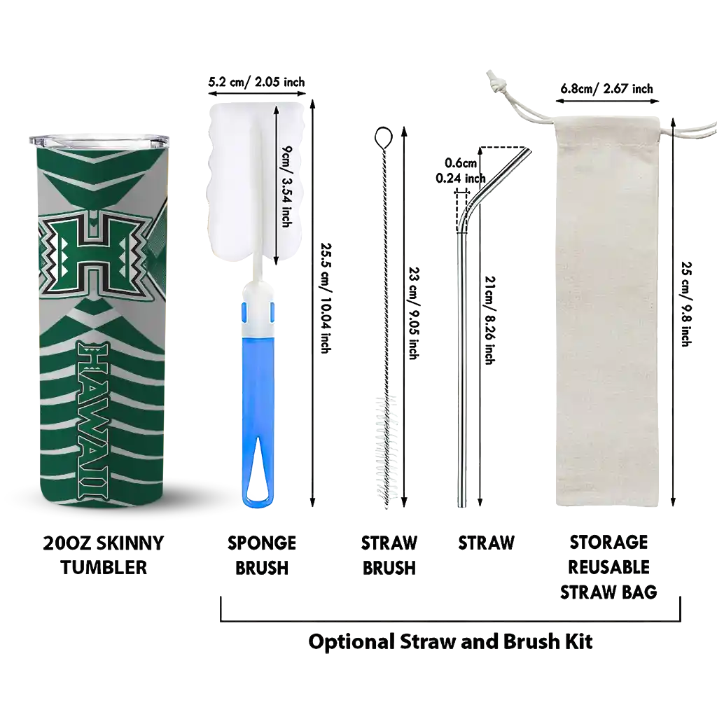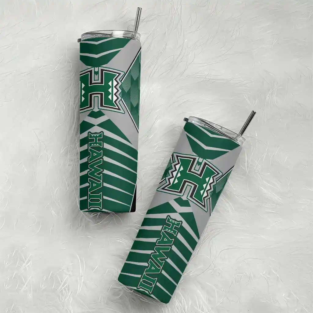 The Custom Hawaii Rainbow Warriors Spiral Burst Print Green Skinny Tumbler tumbler is the perfect way to stay refreshed while showing off your pride for Hawaii Rainbow Warriors. With its double-wall insulation, your drinks stay at the right temperature for hours, whether you're enjoying a hot coffee or keeping your iced drink cold. What's inside? You’ll find 1 stainless steel tumbler, 1 clear lid, and 1 removable straw. It's the perfect blend of function and fan spirit! Ergonomically designed for comfort, made from durable stainless steel, and insulated to maintain your drink’s temperature, this tumbler is a must-have for any dedicated NCAA fan.