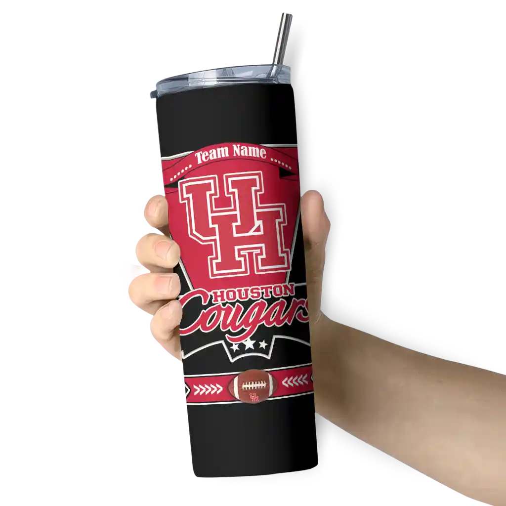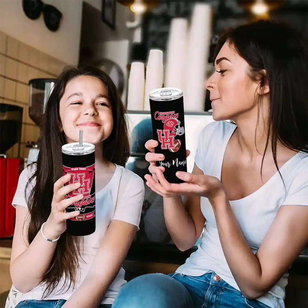 The Custom Houston Cougars Helmet Belt Red Black Skinny Tumbler tumbler is the perfect way to stay refreshed while showing off your pride for Houston Cougars. With its double-wall insulation, your drinks stay at the right temperature for hours, whether you're enjoying a hot coffee or keeping your iced drink cold. What's inside? You’ll find 1 stainless steel tumbler, 1 clear lid, and 1 removable straw. It's the perfect blend of function and fan spirit! Ergonomically designed for comfort, made from durable stainless steel, and insulated to maintain your drink’s temperature, this tumbler is a must-have for any dedicated NCAA fan.