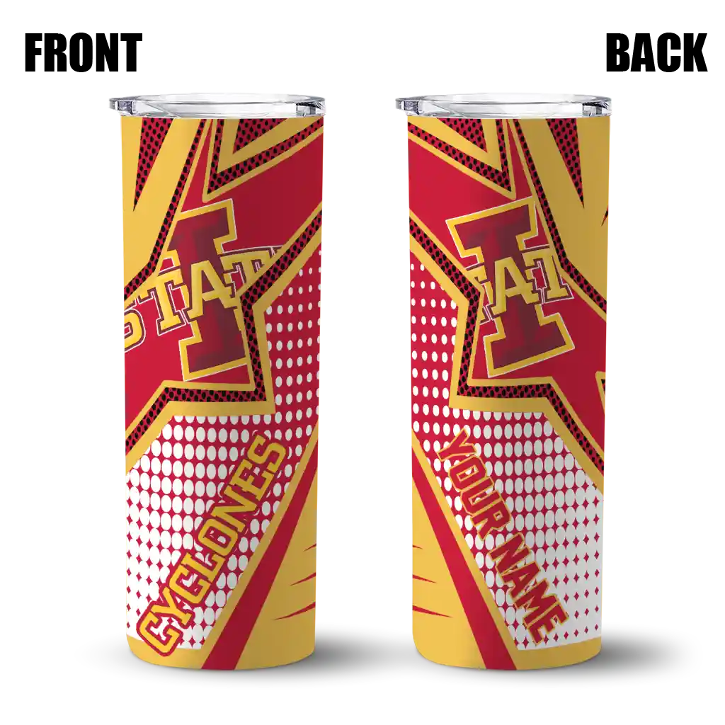 The Custom Iowa State Cyclones Stacked Diamond Red Skinny Tumbler tumbler is the perfect way to stay refreshed while showing off your pride for Iowa State Cyclones. With its double-wall insulation, your drinks stay at the right temperature for hours, whether you're enjoying a hot coffee or keeping your iced drink cold. What's inside? You’ll find 1 stainless steel tumbler, 1 clear lid, and 1 removable straw. It's the perfect blend of function and fan spirit! Ergonomically designed for comfort, made from durable stainless steel, and insulated to maintain your drink’s temperature, this tumbler is a must-have for any dedicated NCAA fan.