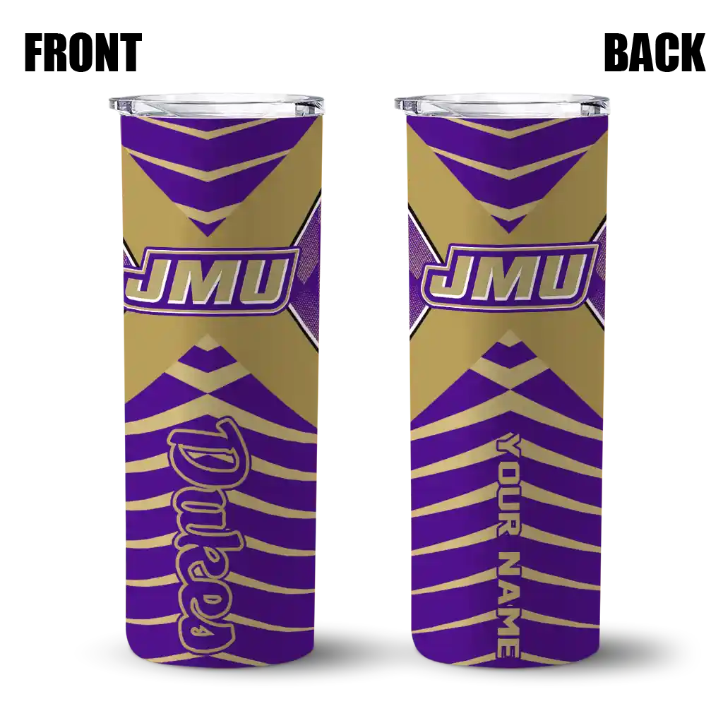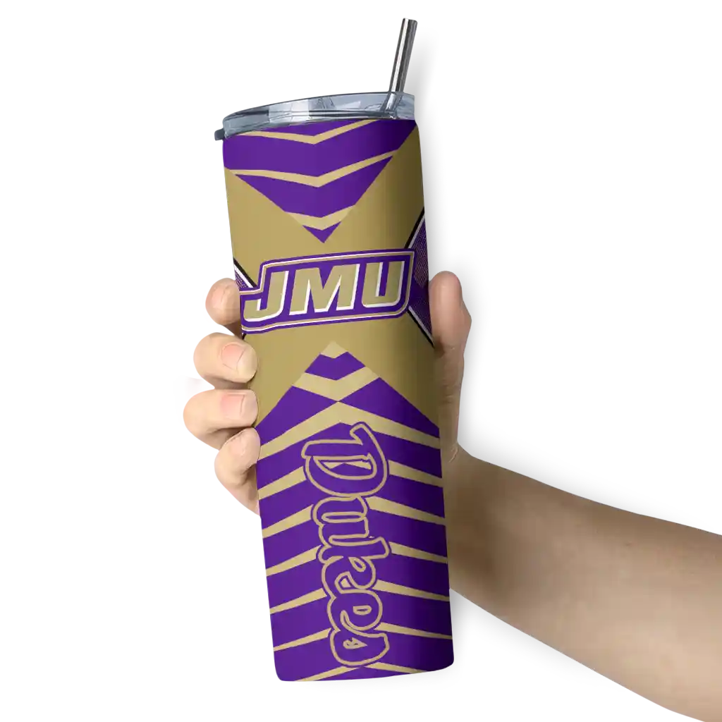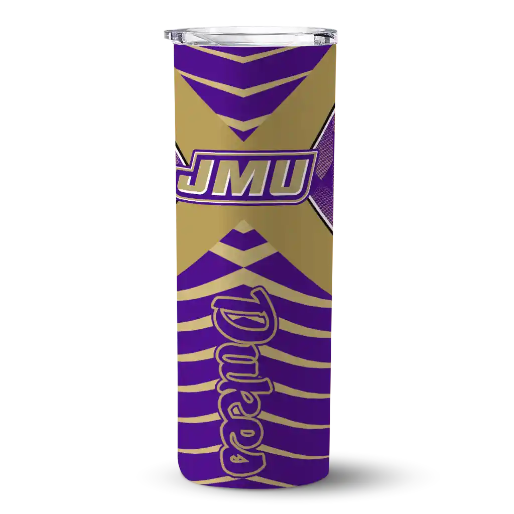The Custom James Madison Dukes Monogram Burst Purple White Skinny Tumbler tumbler is the perfect way to stay refreshed while showing off your pride for James Madison Dukes. With its double-wall insulation, your drinks stay at the right temperature for hours, whether you're enjoying a hot coffee or keeping your iced drink cold. What's inside? You’ll find 1 stainless steel tumbler, 1 clear lid, and 1 removable straw. It's the perfect blend of function and fan spirit! Ergonomically designed for comfort, made from durable stainless steel, and insulated to maintain your drink’s temperature, this tumbler is a must-have for any dedicated NCAA fan.