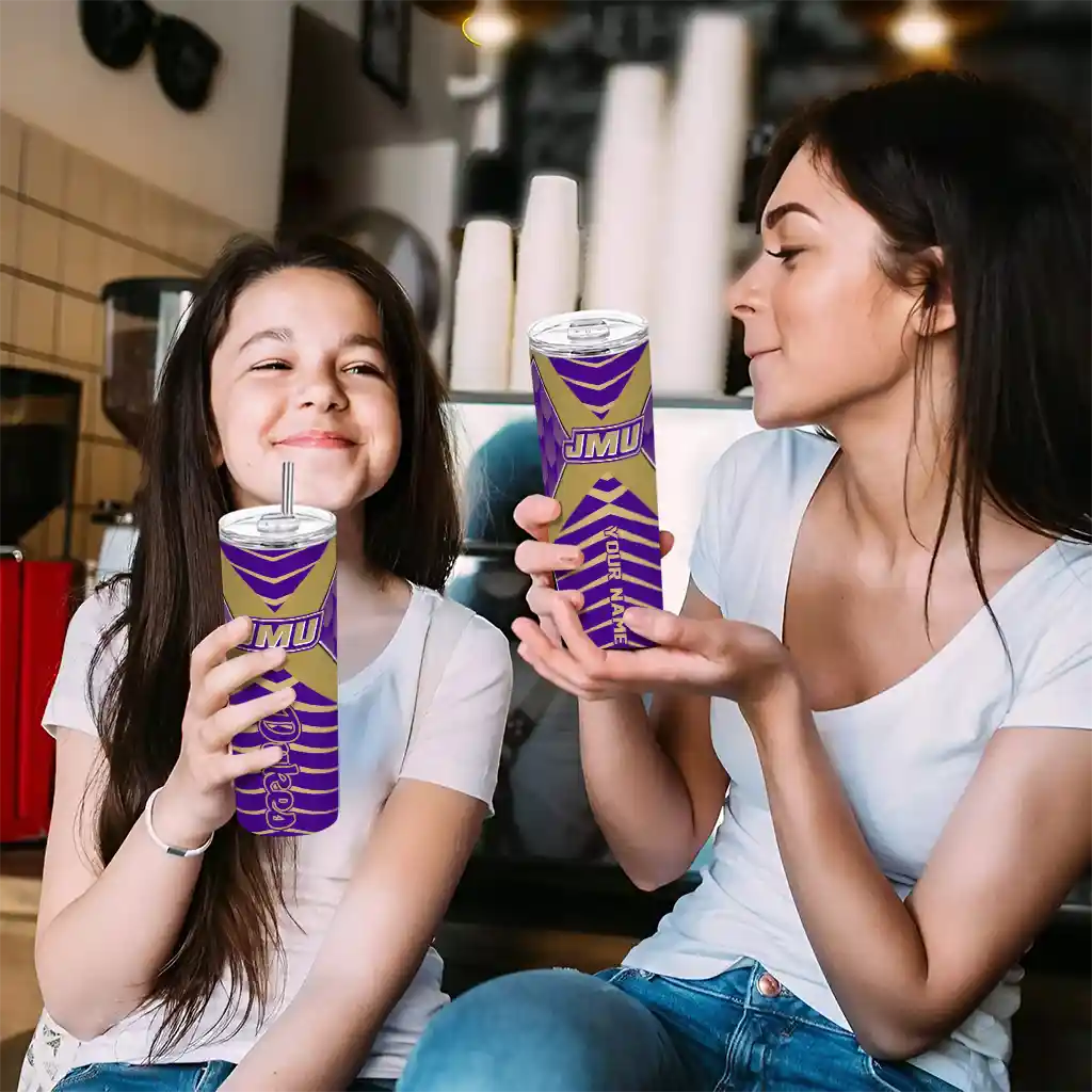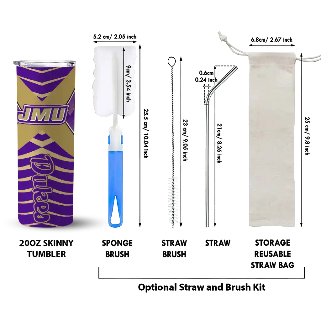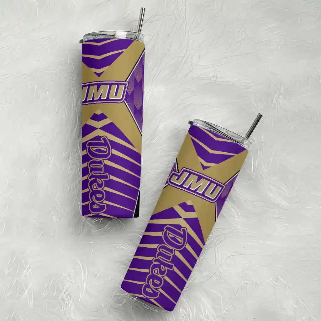 The Custom James Madison Dukes Monogram Burst Purple White Skinny Tumbler tumbler is the perfect way to stay refreshed while showing off your pride for James Madison Dukes. With its double-wall insulation, your drinks stay at the right temperature for hours, whether you're enjoying a hot coffee or keeping your iced drink cold. What's inside? You’ll find 1 stainless steel tumbler, 1 clear lid, and 1 removable straw. It's the perfect blend of function and fan spirit! Ergonomically designed for comfort, made from durable stainless steel, and insulated to maintain your drink’s temperature, this tumbler is a must-have for any dedicated NCAA fan.