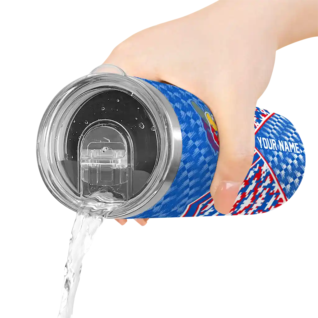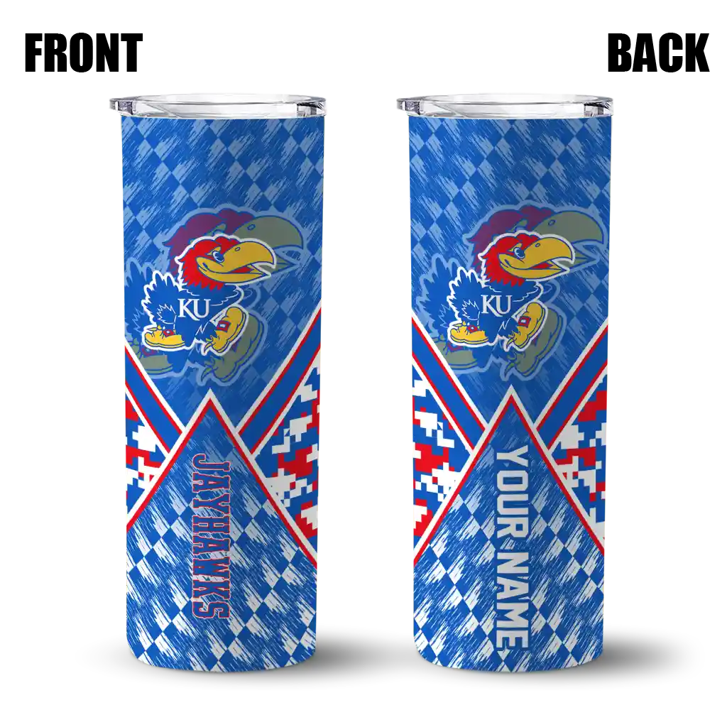 The Custom Kansas Jayhawks Camo Texture Blue Skinny Tumbler tumbler is the perfect way to stay refreshed while showing off your pride for Kansas Jayhawks. With its double-wall insulation, your drinks stay at the right temperature for hours, whether you're enjoying a hot coffee or keeping your iced drink cold. What's inside? You’ll find 1 stainless steel tumbler, 1 clear lid, and 1 removable straw. It's the perfect blend of function and fan spirit! Ergonomically designed for comfort, made from durable stainless steel, and insulated to maintain your drink’s temperature, this tumbler is a must-have for any dedicated NCAA fan.