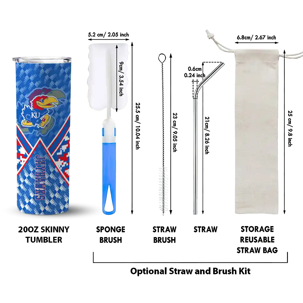 The Customized Kansas Jayhawks Monogram Burst Blue White Skinny Tumbler tumbler is the perfect way to stay refreshed while showing off your pride for Kansas Jayhawks. With its double-wall insulation, your drinks stay at the right temperature for hours, whether you're enjoying a hot coffee or keeping your iced drink cold. What's inside? You’ll find 1 stainless steel tumbler, 1 clear lid, and 1 removable straw. It's the perfect blend of function and fan spirit! Ergonomically designed for comfort, made from durable stainless steel, and insulated to maintain your drink’s temperature, this tumbler is a must-have for any dedicated NCAA fan.