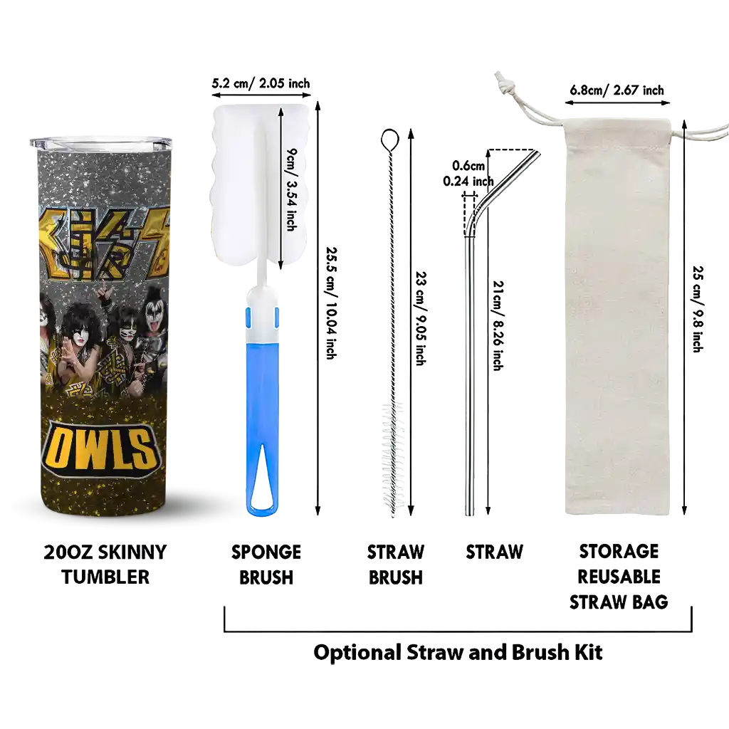 The Personalized Kennesaw State Owls Kiss Band Black Skinny Tumbler tumbler is the perfect way to stay refreshed while showing off your pride for Kennesaw State Owls. With its double-wall insulation, your drinks stay at the right temperature for hours, whether you're enjoying a hot coffee or keeping your iced drink cold. What's inside? You’ll find 1 stainless steel tumbler, 1 clear lid, and 1 removable straw. It's the perfect blend of function and fan spirit! Ergonomically designed for comfort, made from durable stainless steel, and insulated to maintain your drink’s temperature, this tumbler is a must-have for any dedicated NCAA fan.