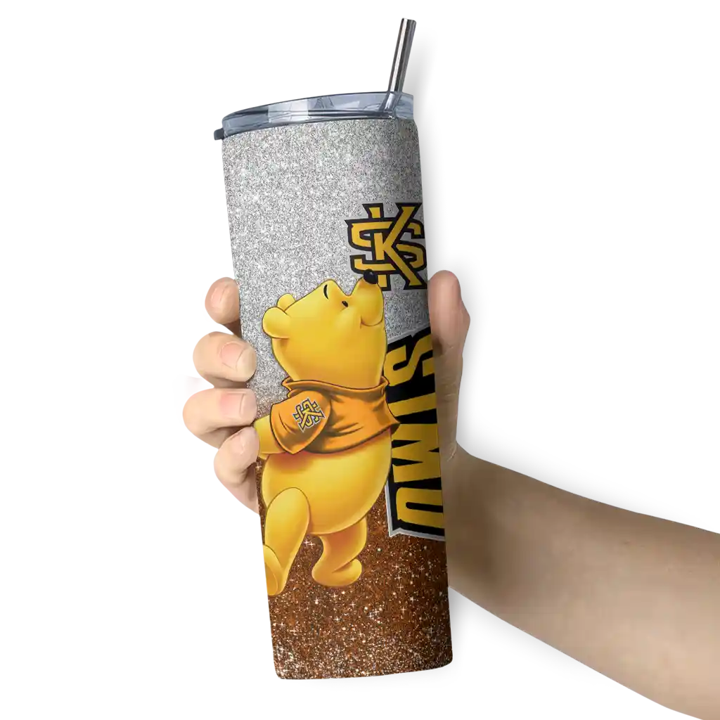 The Personalized Kennesaw State Owls Winnie the Pooh Gold Gray Skinny Tumbler tumbler is the perfect way to stay refreshed while showing off your pride for Kennesaw State Owls. With its double-wall insulation, your drinks stay at the right temperature for hours, whether you're enjoying a hot coffee or keeping your iced drink cold. What's inside? You’ll find 1 stainless steel tumbler, 1 clear lid, and 1 removable straw. It's the perfect blend of function and fan spirit! Ergonomically designed for comfort, made from durable stainless steel, and insulated to maintain your drink’s temperature, this tumbler is a must-have for any dedicated NCAA fan.