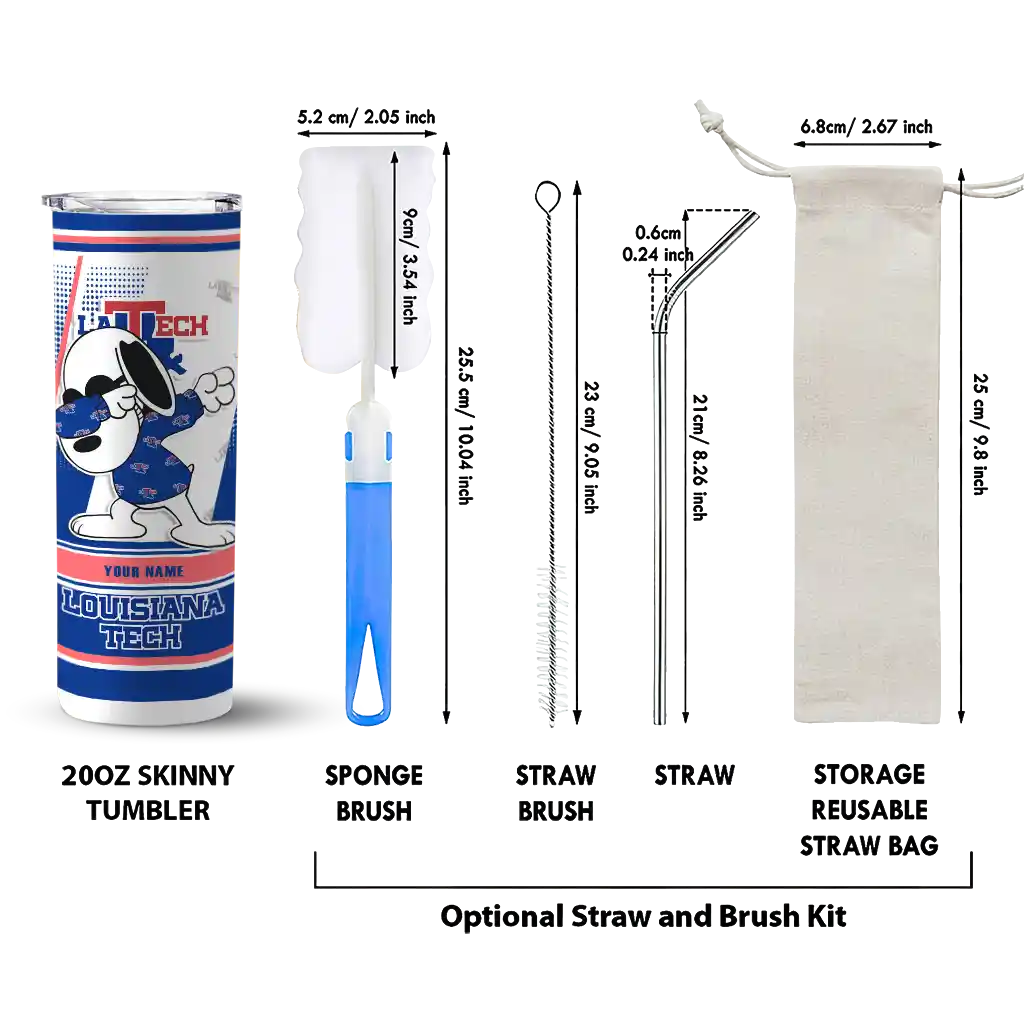 The Custom LA Tech Snoopy Dog Blue White Skinny Tumbler tumbler is the perfect way to stay refreshed while showing off your pride for LA Tech. With its double-wall insulation, your drinks stay at the right temperature for hours, whether you're enjoying a hot coffee or keeping your iced drink cold. What's inside? You’ll find 1 stainless steel tumbler, 1 clear lid, and 1 removable straw. It's the perfect blend of function and fan spirit! Ergonomically designed for comfort, made from durable stainless steel, and insulated to maintain your drink’s temperature, this tumbler is a must-have for any dedicated NCAA fan.