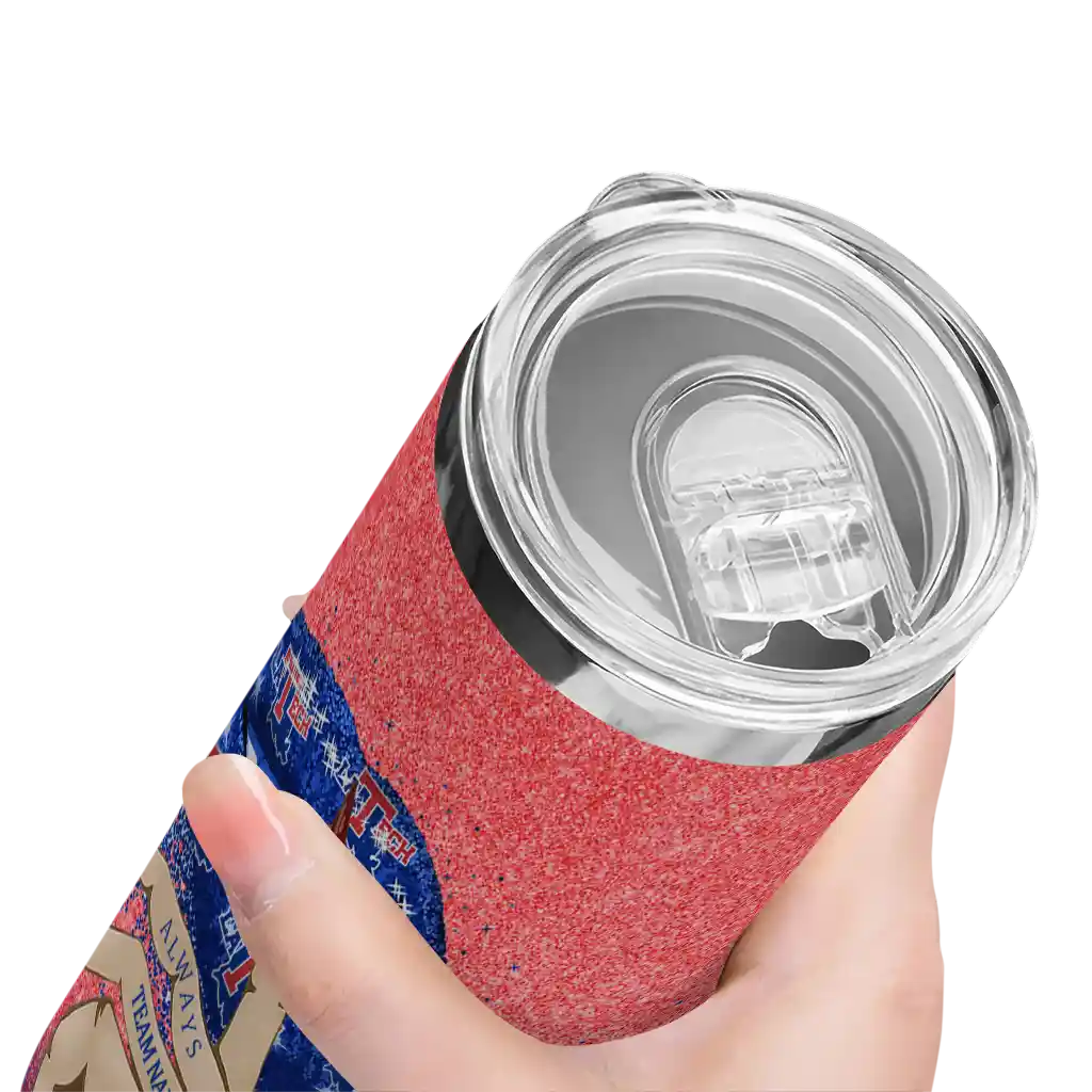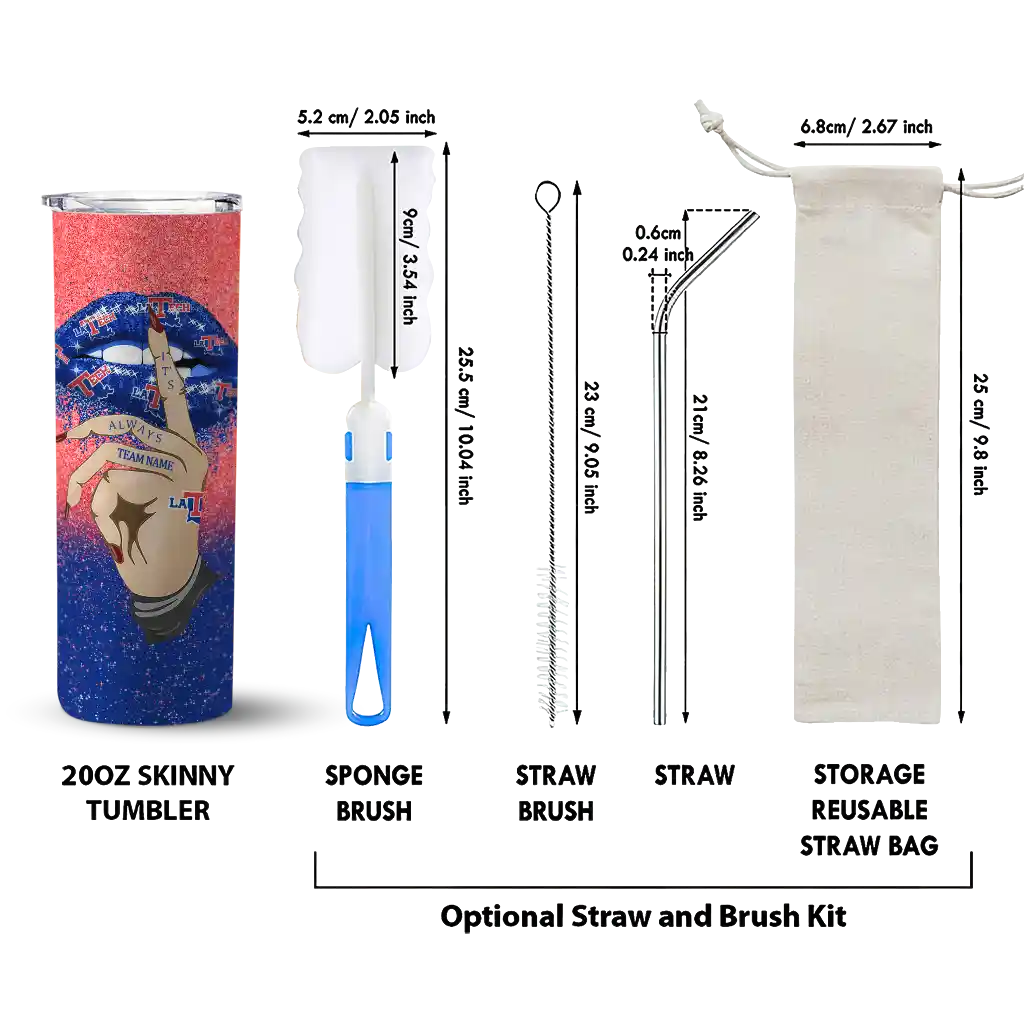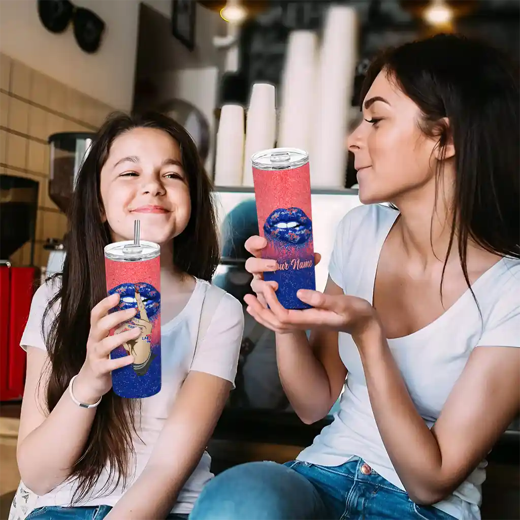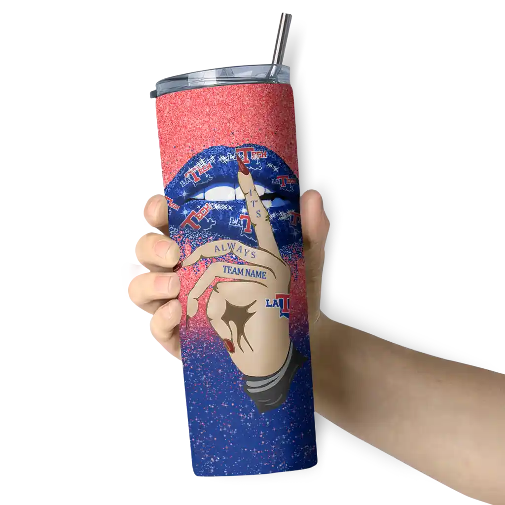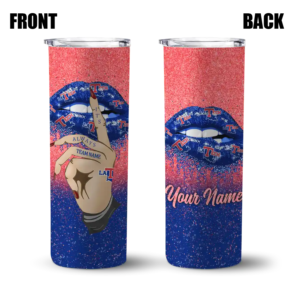 The Personalized LA Tech Sparkle Lips Blue Skinny Tumbler tumbler is the perfect way to stay refreshed while showing off your pride for LA Tech. With its double-wall insulation, your drinks stay at the right temperature for hours, whether you're enjoying a hot coffee or keeping your iced drink cold. What's inside? You’ll find 1 stainless steel tumbler, 1 clear lid, and 1 removable straw. It's the perfect blend of function and fan spirit! Ergonomically designed for comfort, made from durable stainless steel, and insulated to maintain your drink’s temperature, this tumbler is a must-have for any dedicated NCAA fan.
