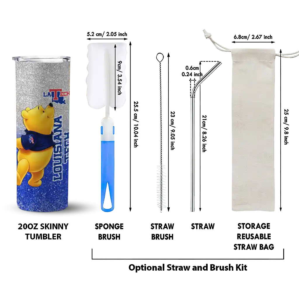 The Personalized LA Tech Winnie the Pooh Blue Gray Skinny Tumbler tumbler is the perfect way to stay refreshed while showing off your pride for LA Tech. With its double-wall insulation, your drinks stay at the right temperature for hours, whether you're enjoying a hot coffee or keeping your iced drink cold. What's inside? You’ll find 1 stainless steel tumbler, 1 clear lid, and 1 removable straw. It's the perfect blend of function and fan spirit! Ergonomically designed for comfort, made from durable stainless steel, and insulated to maintain your drink’s temperature, this tumbler is a must-have for any dedicated NCAA fan.