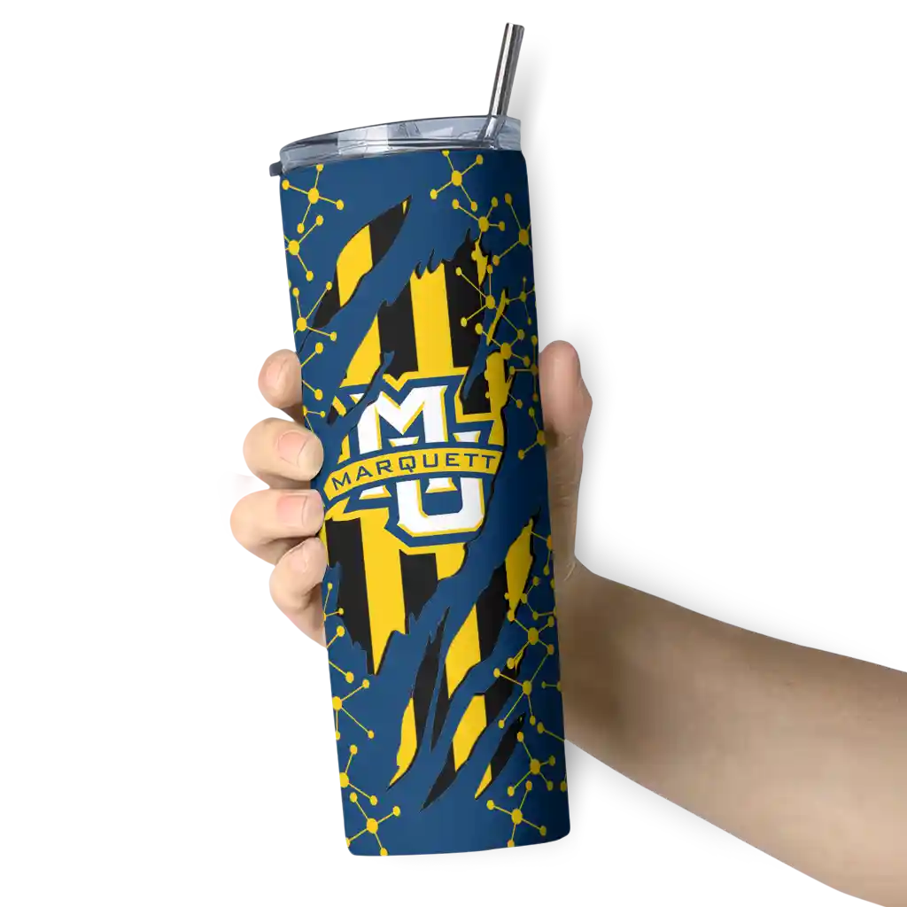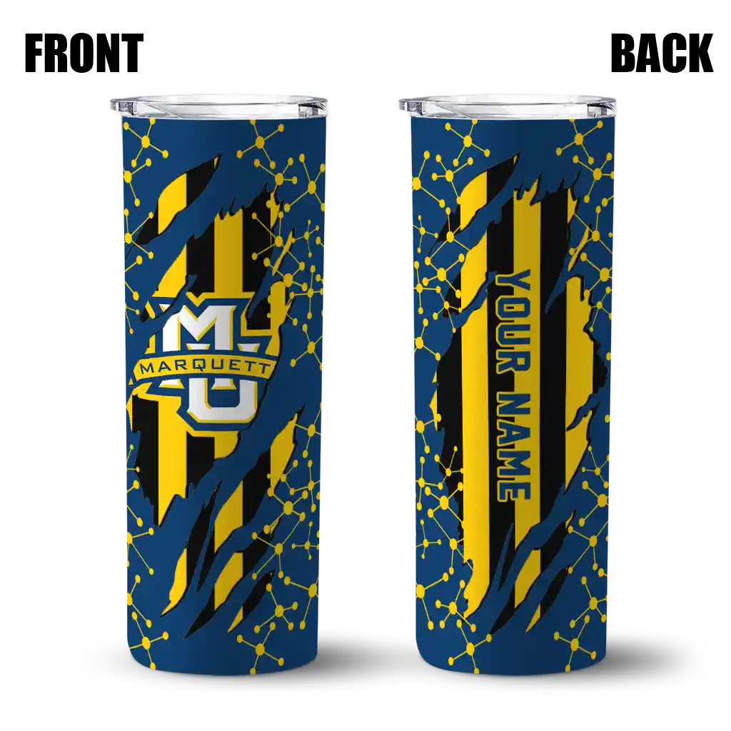 The Custom Marquette Golden Eagles Swirl Texture Blue Skinny Tumbler tumbler is the perfect way to stay refreshed while showing off your pride for Marquette Golden Eagles. With its double-wall insulation, your drinks stay at the right temperature for hours, whether you're enjoying a hot coffee or keeping your iced drink cold. What's inside? You’ll find 1 stainless steel tumbler, 1 clear lid, and 1 removable straw. It's the perfect blend of function and fan spirit! Ergonomically designed for comfort, made from durable stainless steel, and insulated to maintain your drink’s temperature, this tumbler is a must-have for any dedicated NCAA fan.