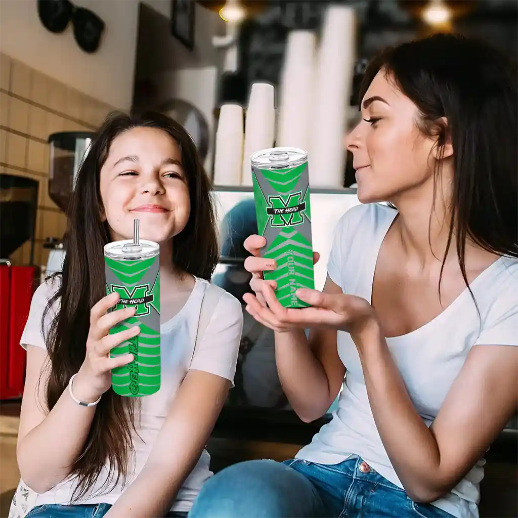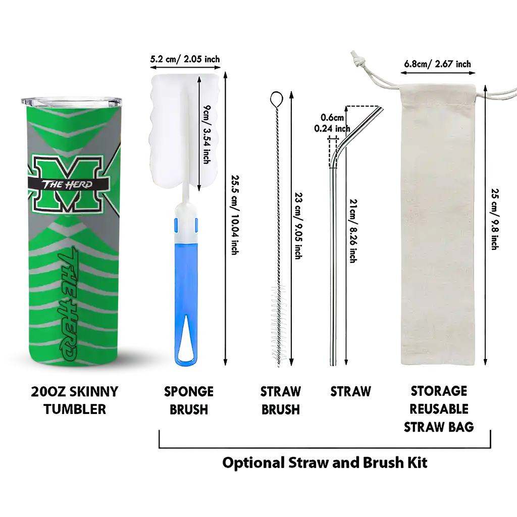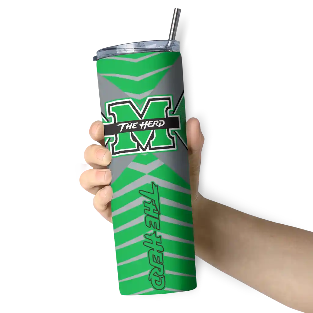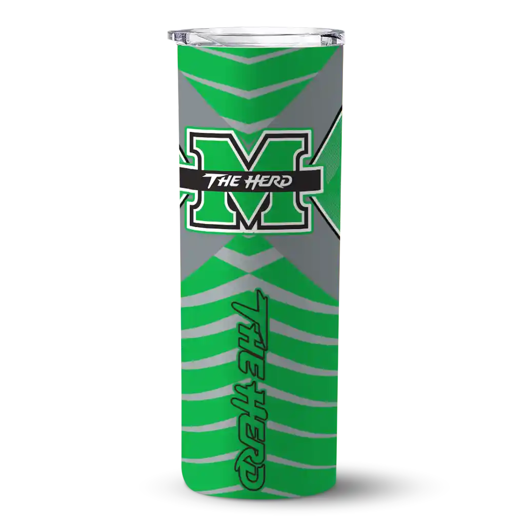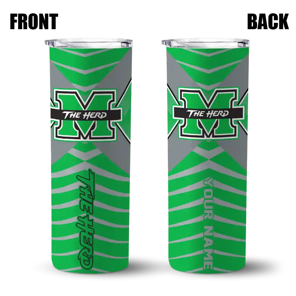 The Customized Marshall Thundering Herd Chevron Stripes Green Skinny Tumbler tumbler is the perfect way to stay refreshed while showing off your pride for Marshall Thundering Herd. With its double-wall insulation, your drinks stay at the right temperature for hours, whether you're enjoying a hot coffee or keeping your iced drink cold. What's inside? You’ll find 1 stainless steel tumbler, 1 clear lid, and 1 removable straw. It's the perfect blend of function and fan spirit! Ergonomically designed for comfort, made from durable stainless steel, and insulated to maintain your drink’s temperature, this tumbler is a must-have for any dedicated NCAA fan.