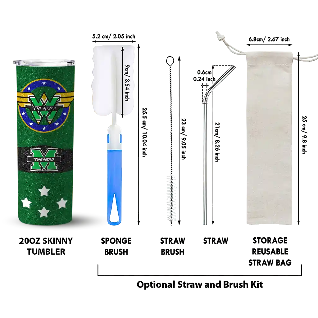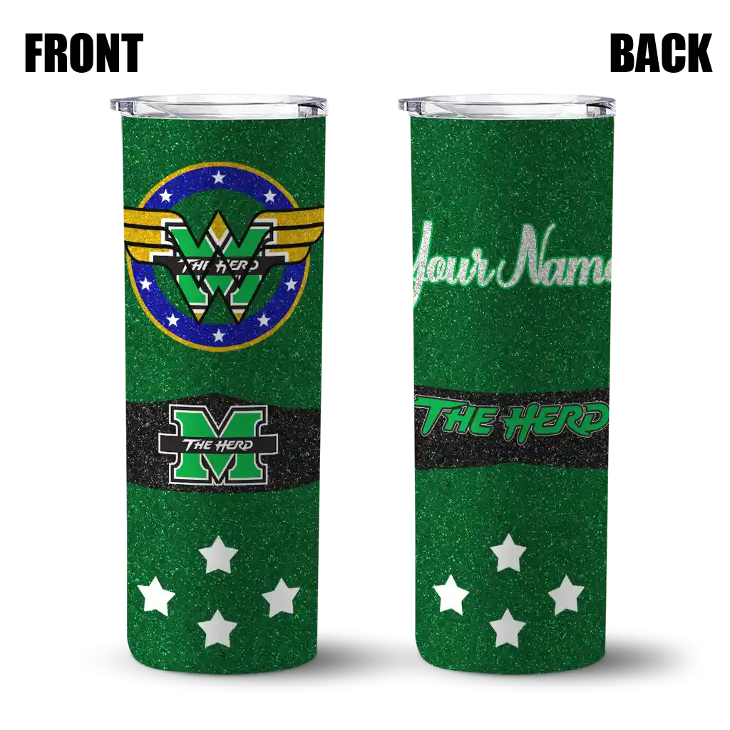The Personalized Marshall Thundering Herd Chevron Patch Green Skinny Tumbler tumbler is the perfect way to stay refreshed while showing off your pride for Marshall Thundering Herd. With its double-wall insulation, your drinks stay at the right temperature for hours, whether you're enjoying a hot coffee or keeping your iced drink cold. What's inside? You’ll find 1 stainless steel tumbler, 1 clear lid, and 1 removable straw. It's the perfect blend of function and fan spirit! Ergonomically designed for comfort, made from durable stainless steel, and insulated to maintain your drink’s temperature, this tumbler is a must-have for any dedicated NCAA fan.
