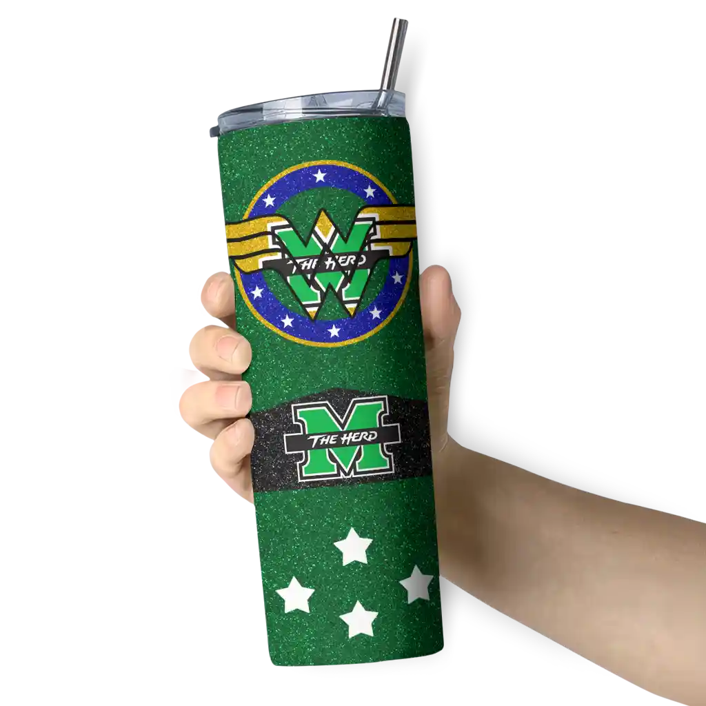 The Customized Marshall Thundering Herd Chevron Stripes Green Skinny Tumbler tumbler is the perfect way to stay refreshed while showing off your pride for Marshall Thundering Herd. With its double-wall insulation, your drinks stay at the right temperature for hours, whether you're enjoying a hot coffee or keeping your iced drink cold. What's inside? You’ll find 1 stainless steel tumbler, 1 clear lid, and 1 removable straw. It's the perfect blend of function and fan spirit! Ergonomically designed for comfort, made from durable stainless steel, and insulated to maintain your drink’s temperature, this tumbler is a must-have for any dedicated NCAA fan.