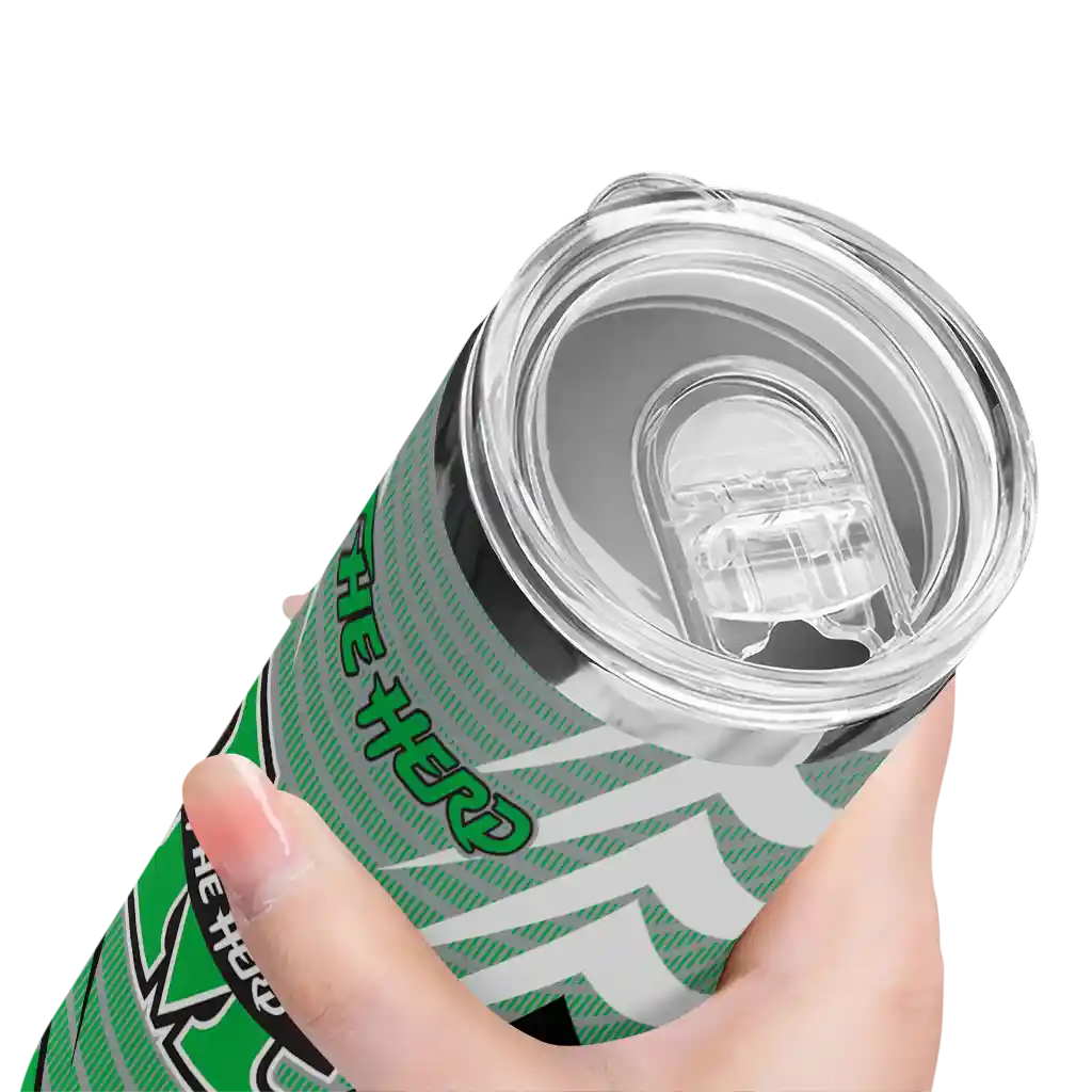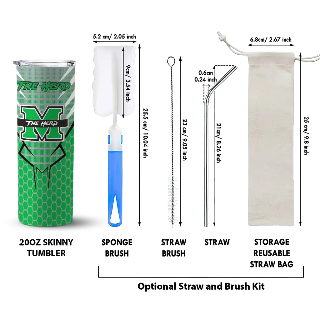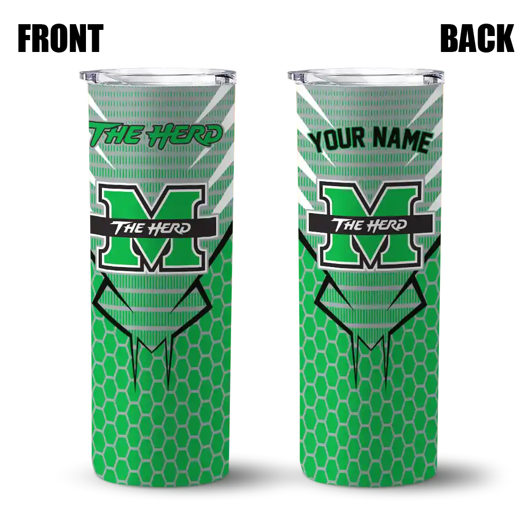 The Customized Marshall Thundering Herd Chevron Stripes Green Skinny Tumbler tumbler is the perfect way to stay refreshed while showing off your pride for Marshall Thundering Herd. With its double-wall insulation, your drinks stay at the right temperature for hours, whether you're enjoying a hot coffee or keeping your iced drink cold. What's inside? You’ll find 1 stainless steel tumbler, 1 clear lid, and 1 removable straw. It's the perfect blend of function and fan spirit! Ergonomically designed for comfort, made from durable stainless steel, and insulated to maintain your drink’s temperature, this tumbler is a must-have for any dedicated NCAA fan.