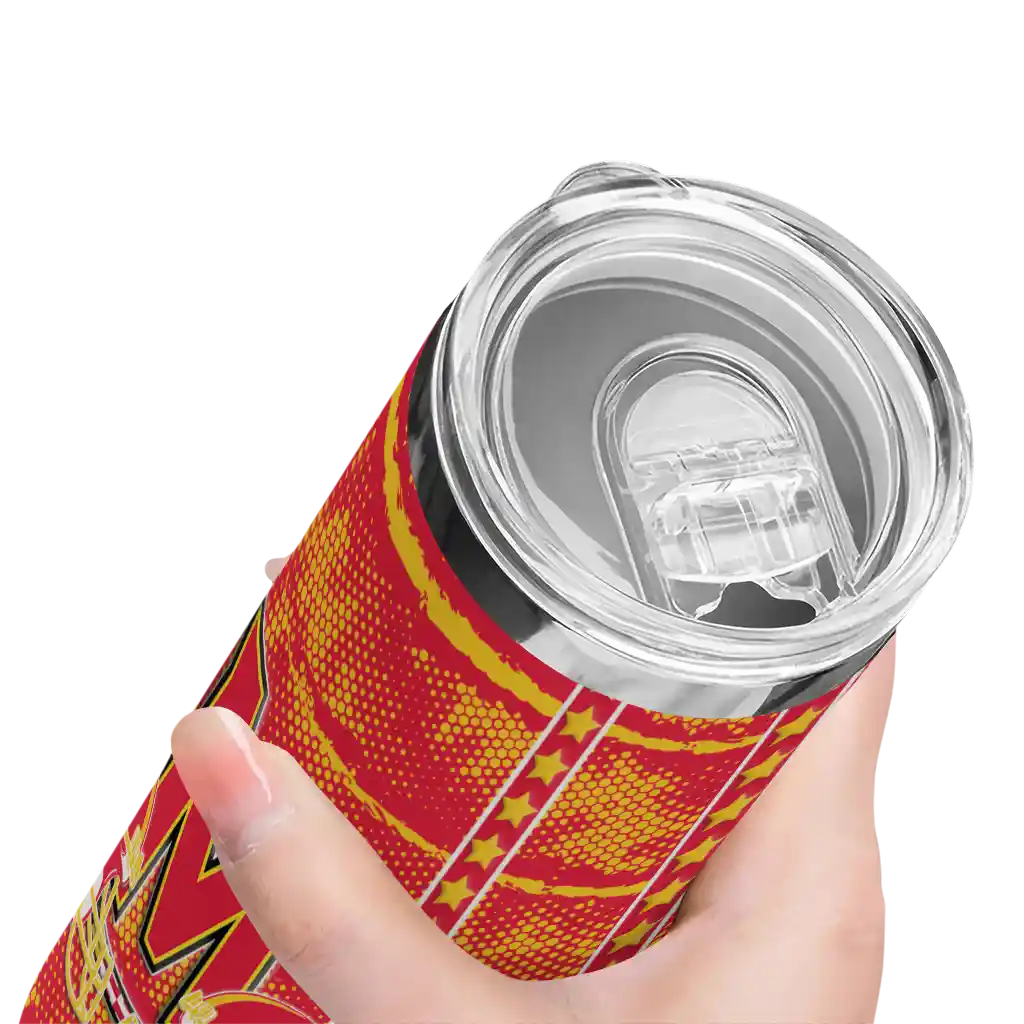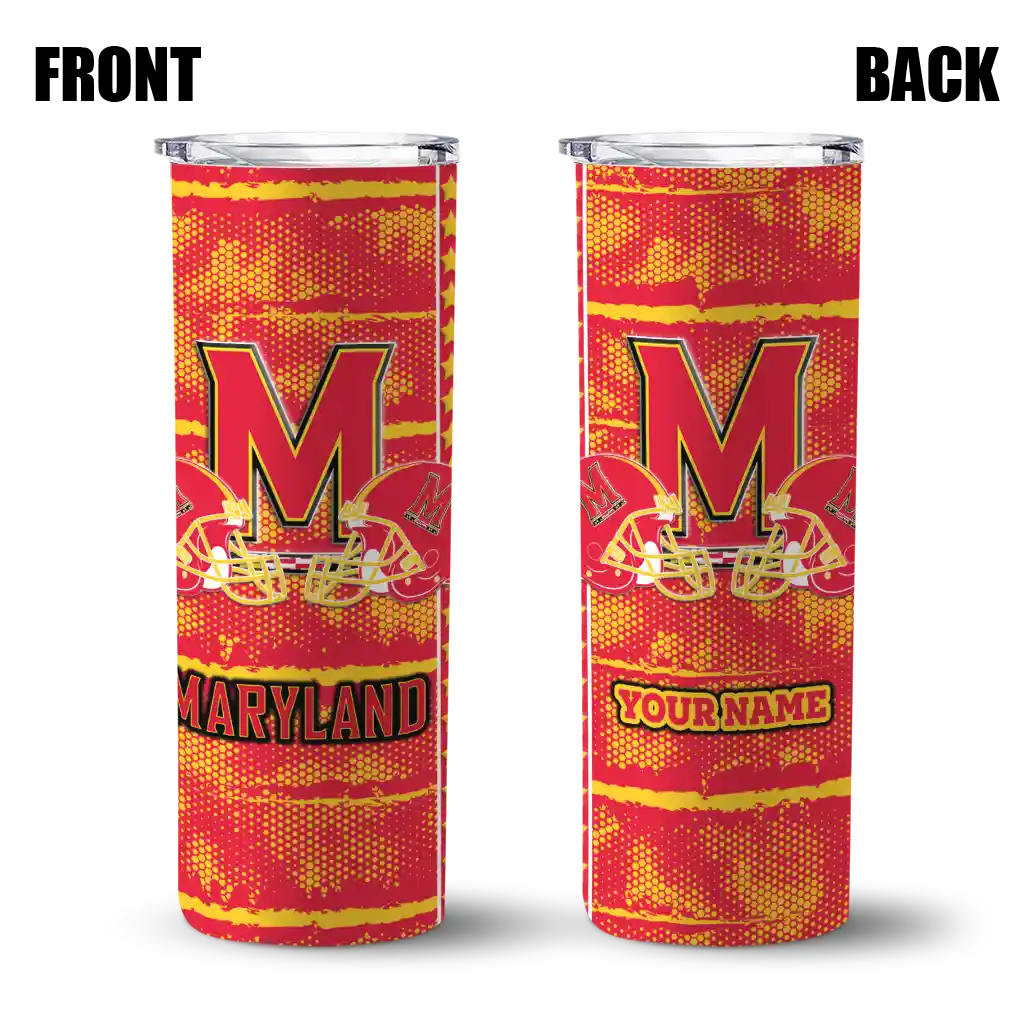 The Personalized Maryland Terrapins Helmet Belt Red Black Skinny Tumbler tumbler is the perfect way to stay refreshed while showing off your pride for Maryland Terrapins. With its double-wall insulation, your drinks stay at the right temperature for hours, whether you're enjoying a hot coffee or keeping your iced drink cold. What's inside? You’ll find 1 stainless steel tumbler, 1 clear lid, and 1 removable straw. It's the perfect blend of function and fan spirit! Ergonomically designed for comfort, made from durable stainless steel, and insulated to maintain your drink’s temperature, this tumbler is a must-have for any dedicated NCAA fan.