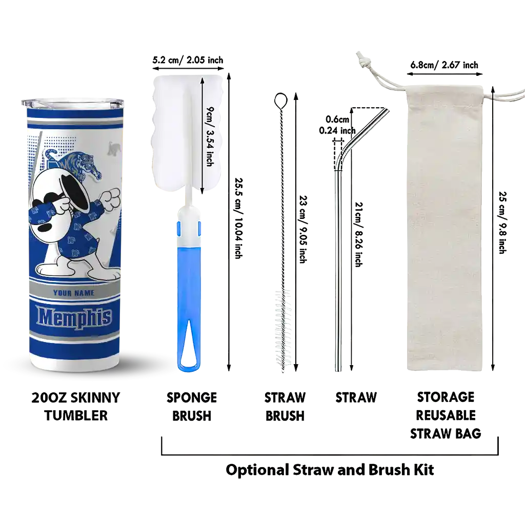 The Custom Memphis Tigers Snoopy Dog Blue White Skinny Tumbler tumbler is the perfect way to stay refreshed while showing off your pride for Memphis Tigers. With its double-wall insulation, your drinks stay at the right temperature for hours, whether you're enjoying a hot coffee or keeping your iced drink cold. What's inside? You’ll find 1 stainless steel tumbler, 1 clear lid, and 1 removable straw. It's the perfect blend of function and fan spirit! Ergonomically designed for comfort, made from durable stainless steel, and insulated to maintain your drink’s temperature, this tumbler is a must-have for any dedicated NCAA fan.