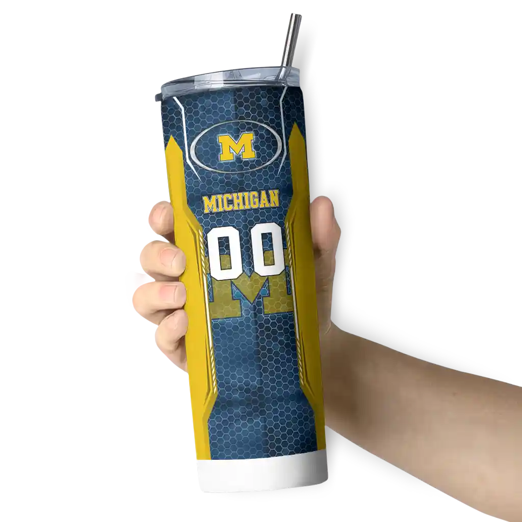 No question about it—the Custom Michigan Wolverines Hexagon Armor Blue Curved Tumbler is the ultimate way to stay refreshed while rocking your Michigan Wolverines pride. From the stadium to your tailgate, or just chilling at home, this sleek tumbler makes sure you stay hydrated in style. What’s in the box? A stainless steel tumbler, clear lid, and removable straw—all the essentials for keeping your favorite drinks on point!