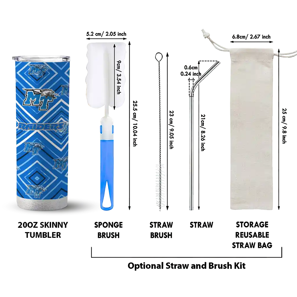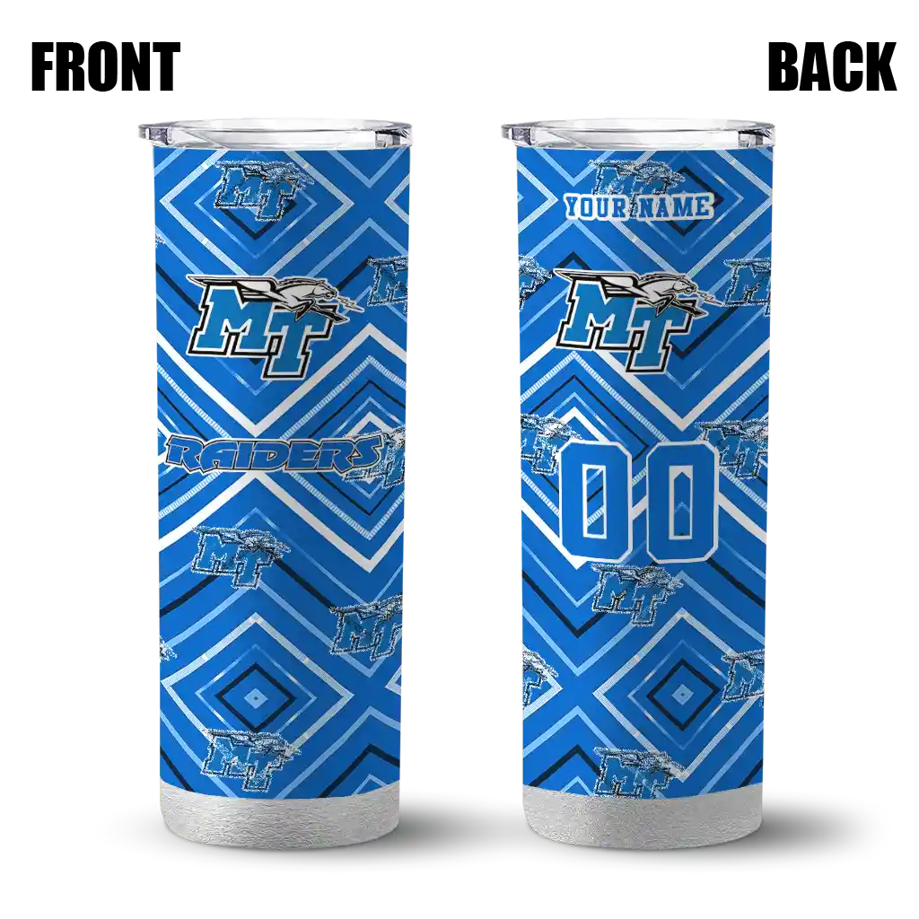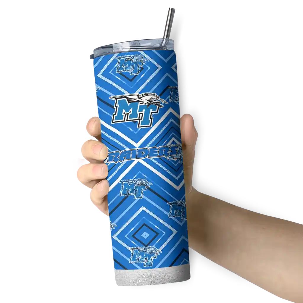 The Customized Middle Tennessee Blue Raiders Star Cluster Blue Skinny Tumbler tumbler is the perfect way to stay refreshed while showing off your pride for Middle Tennessee Blue Raiders. With its double-wall insulation, your drinks stay at the right temperature for hours, whether you're enjoying a hot coffee or keeping your iced drink cold. What's inside? You’ll find 1 stainless steel tumbler, 1 clear lid, and 1 removable straw. It's the perfect blend of function and fan spirit! Ergonomically designed for comfort, made from durable stainless steel, and insulated to maintain your drink’s temperature, this tumbler is a must-have for any dedicated NCAA fan.