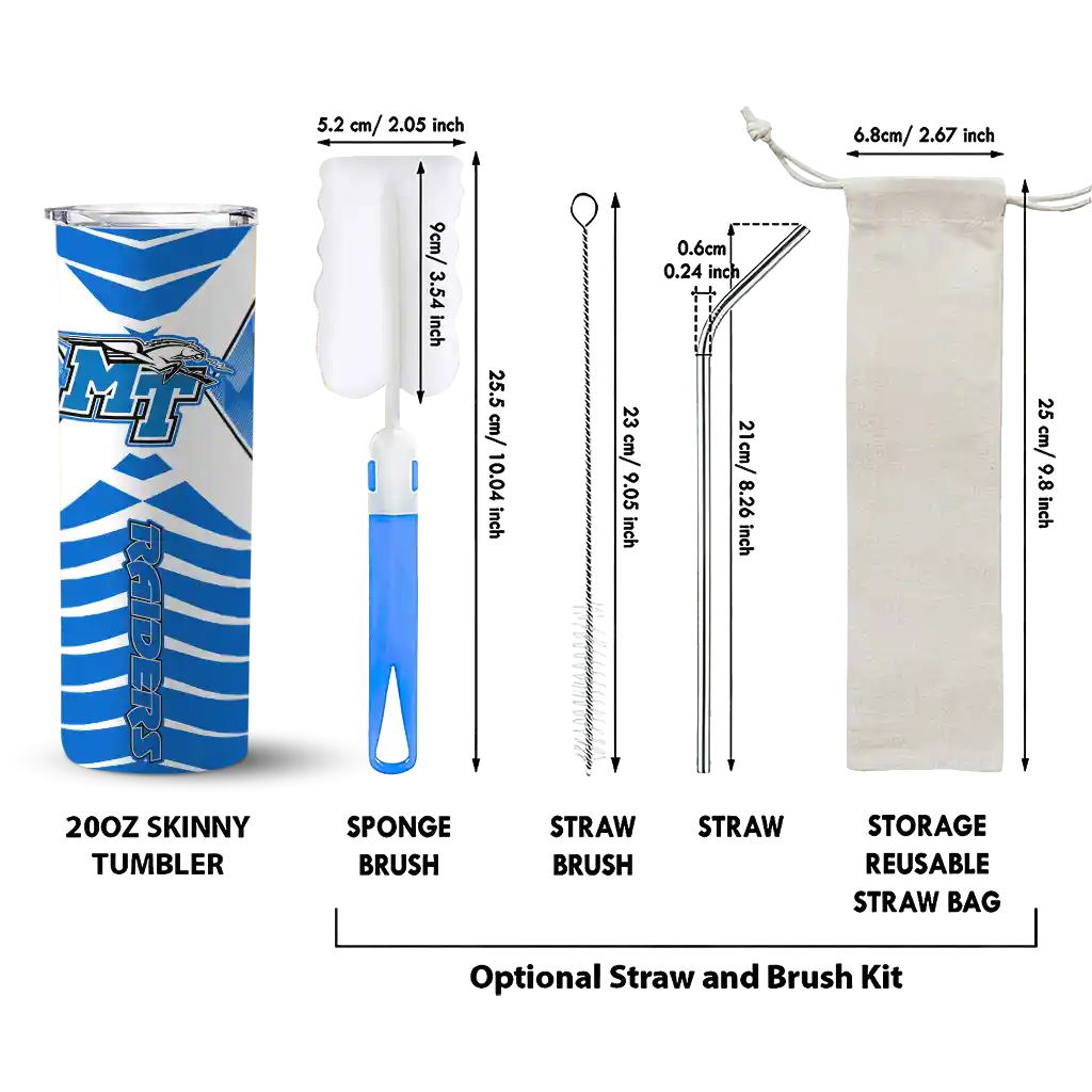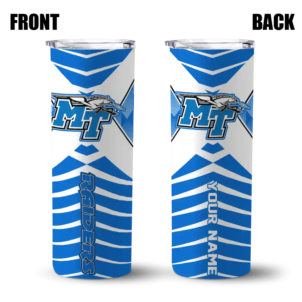 The Customized Middle Tennessee Blue Raiders Camo Texture Blue Skinny Tumbler tumbler is the perfect way to stay refreshed while showing off your pride for Middle Tennessee Blue Raiders. With its double-wall insulation, your drinks stay at the right temperature for hours, whether you're enjoying a hot coffee or keeping your iced drink cold. What's inside? You’ll find 1 stainless steel tumbler, 1 clear lid, and 1 removable straw. It's the perfect blend of function and fan spirit! Ergonomically designed for comfort, made from durable stainless steel, and insulated to maintain your drink’s temperature, this tumbler is a must-have for any dedicated NCAA fan.