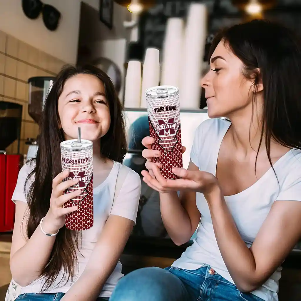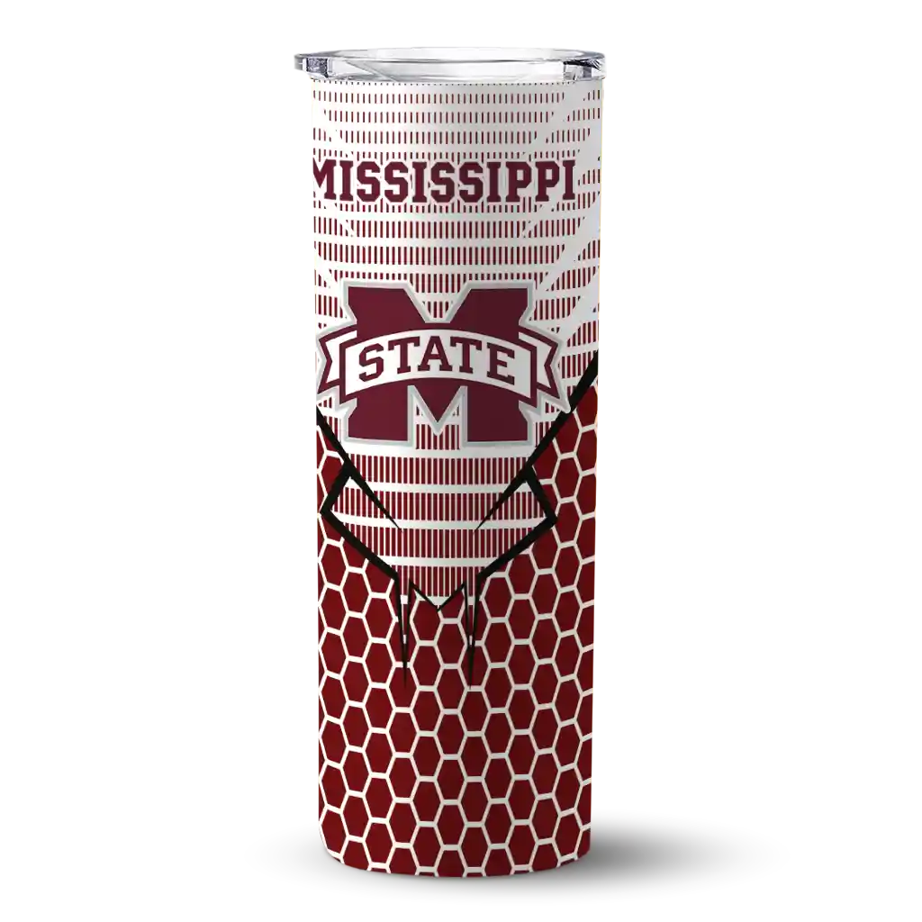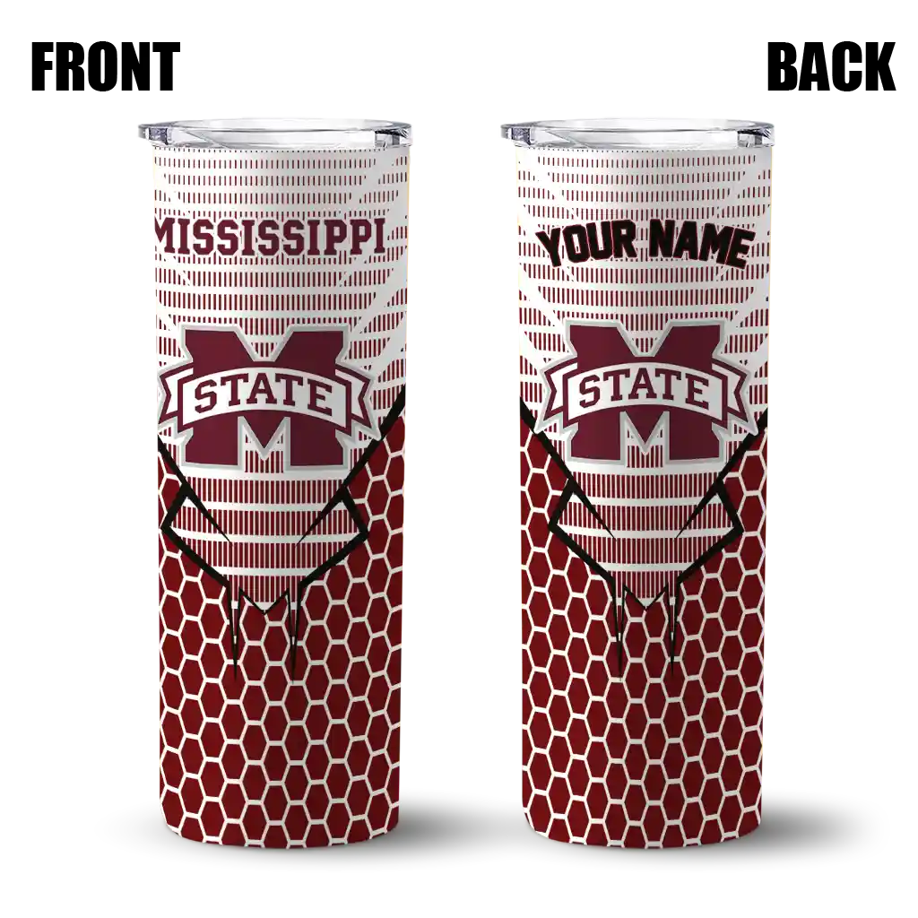 The Customized Mississippi State Bulldogs Chevron Stripes Maroon Skinny Tumbler tumbler is the perfect way to stay refreshed while showing off your pride for Mississippi State Bulldogs. With its double-wall insulation, your drinks stay at the right temperature for hours, whether you're enjoying a hot coffee or keeping your iced drink cold. What's inside? You’ll find 1 stainless steel tumbler, 1 clear lid, and 1 removable straw. It's the perfect blend of function and fan spirit! Ergonomically designed for comfort, made from durable stainless steel, and insulated to maintain your drink’s temperature, this tumbler is a must-have for any dedicated NCAA fan.