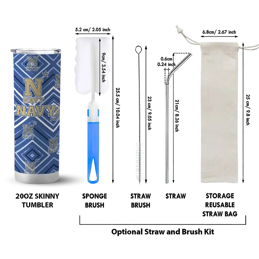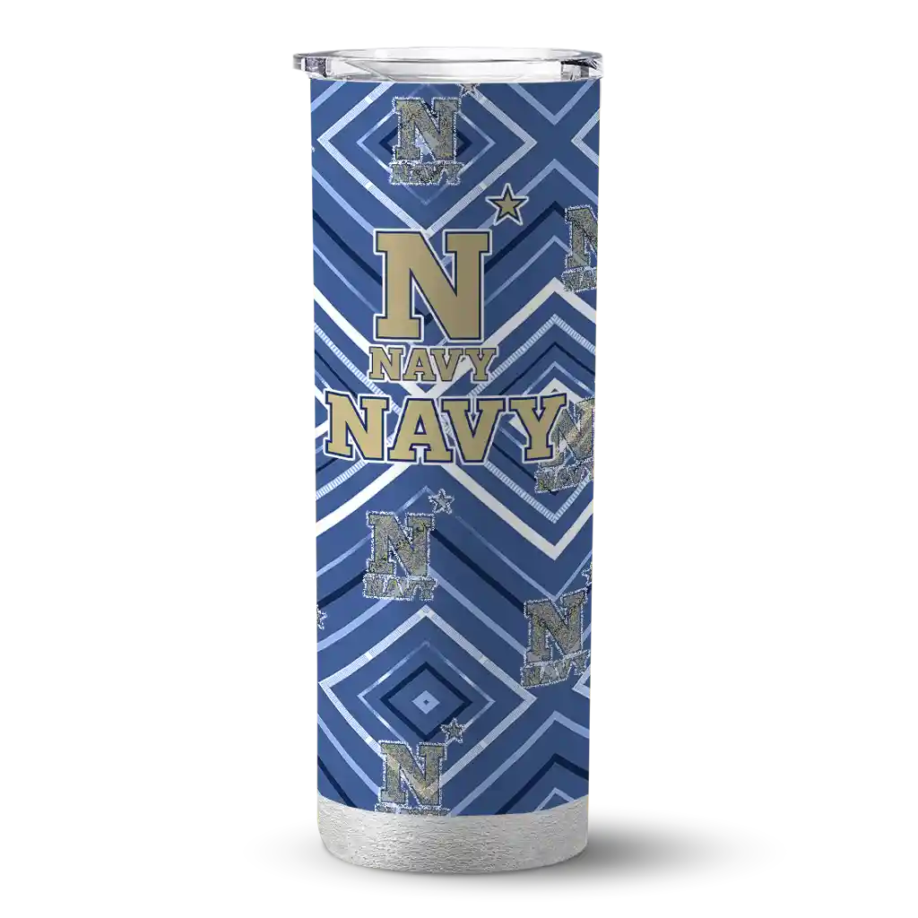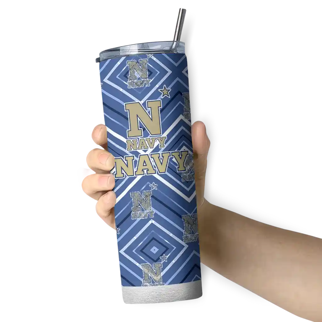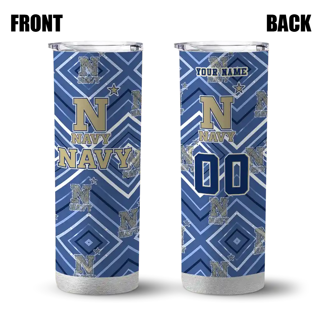 The Personalized Navy Midshipmen Stacked Diamond Blue Skinny Tumbler tumbler is the perfect way to stay refreshed while showing off your pride for Navy Midshipmen. With its double-wall insulation, your drinks stay at the right temperature for hours, whether you're enjoying a hot coffee or keeping your iced drink cold. What's inside? You’ll find 1 stainless steel tumbler, 1 clear lid, and 1 removable straw. It's the perfect blend of function and fan spirit! Ergonomically designed for comfort, made from durable stainless steel, and insulated to maintain your drink’s temperature, this tumbler is a must-have for any dedicated NCAA fan.