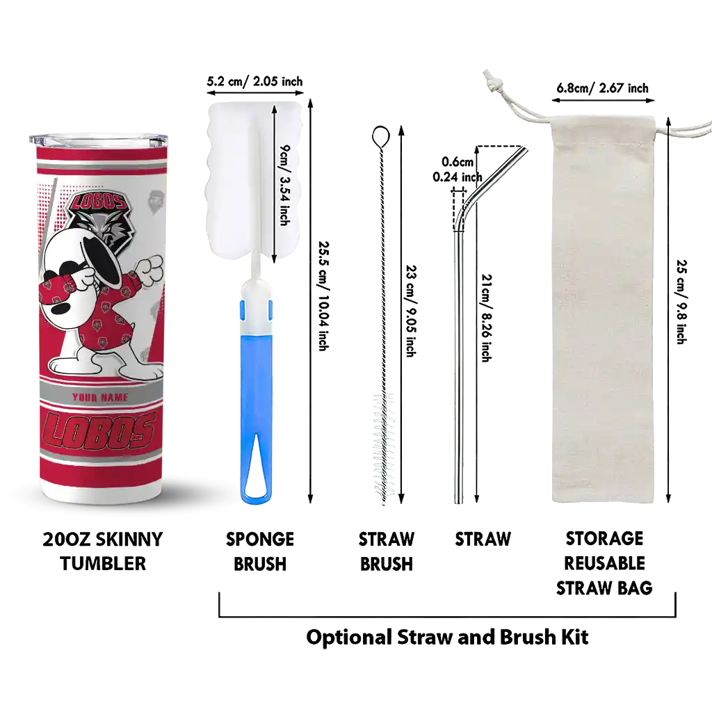 The Customized New Mexico Lobos Snoopy Dog Red White Skinny Tumbler tumbler is the perfect way to stay refreshed while showing off your pride for New Mexico Lobos. With its double-wall insulation, your drinks stay at the right temperature for hours, whether you're enjoying a hot coffee or keeping your iced drink cold. What's inside? You’ll find 1 stainless steel tumbler, 1 clear lid, and 1 removable straw. It's the perfect blend of function and fan spirit! Ergonomically designed for comfort, made from durable stainless steel, and insulated to maintain your drink’s temperature, this tumbler is a must-have for any dedicated NCAA fan.