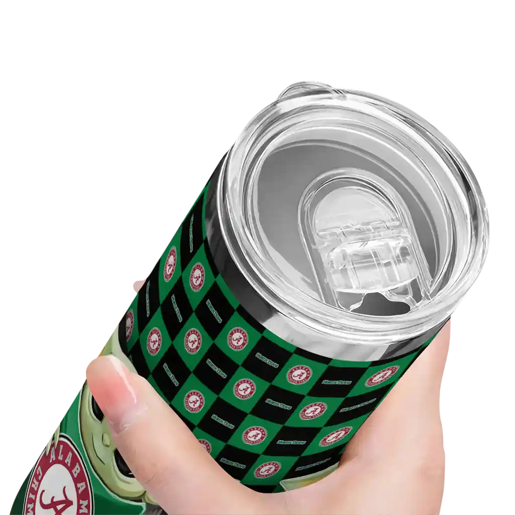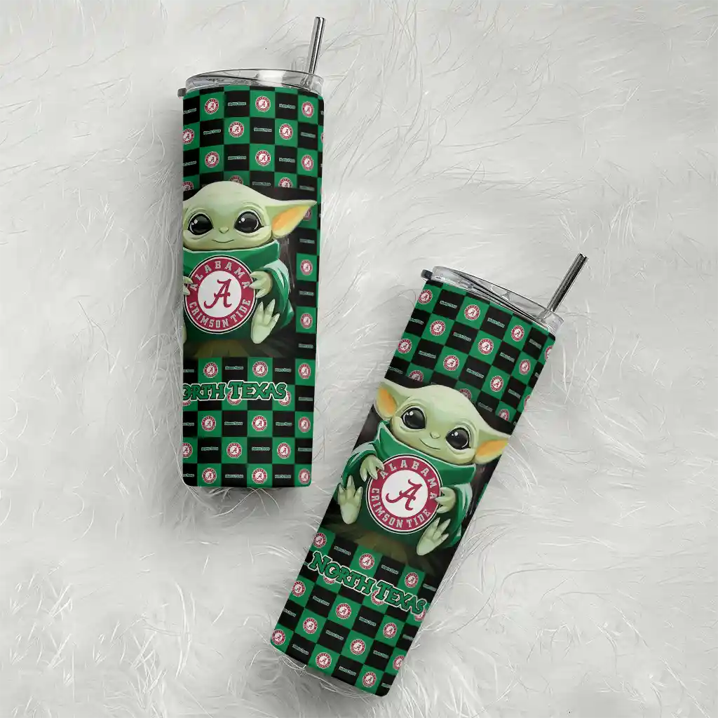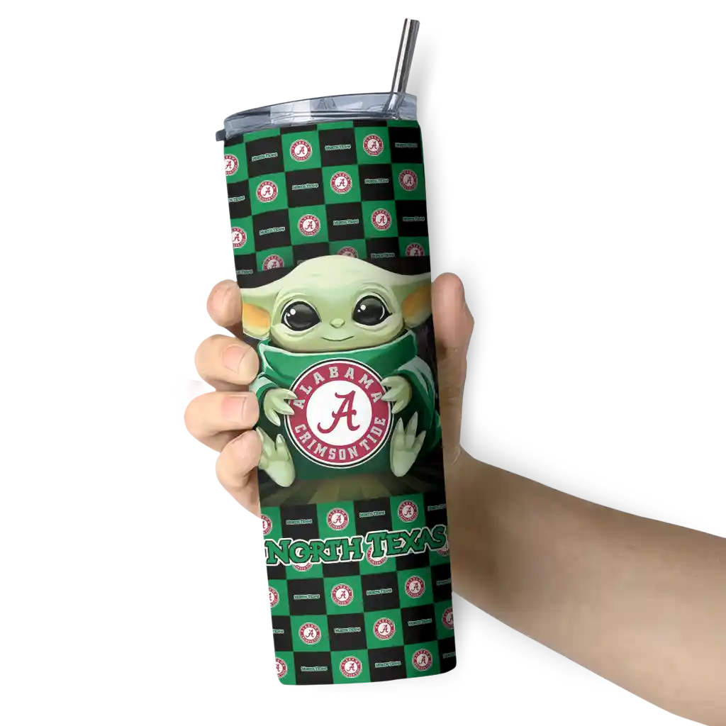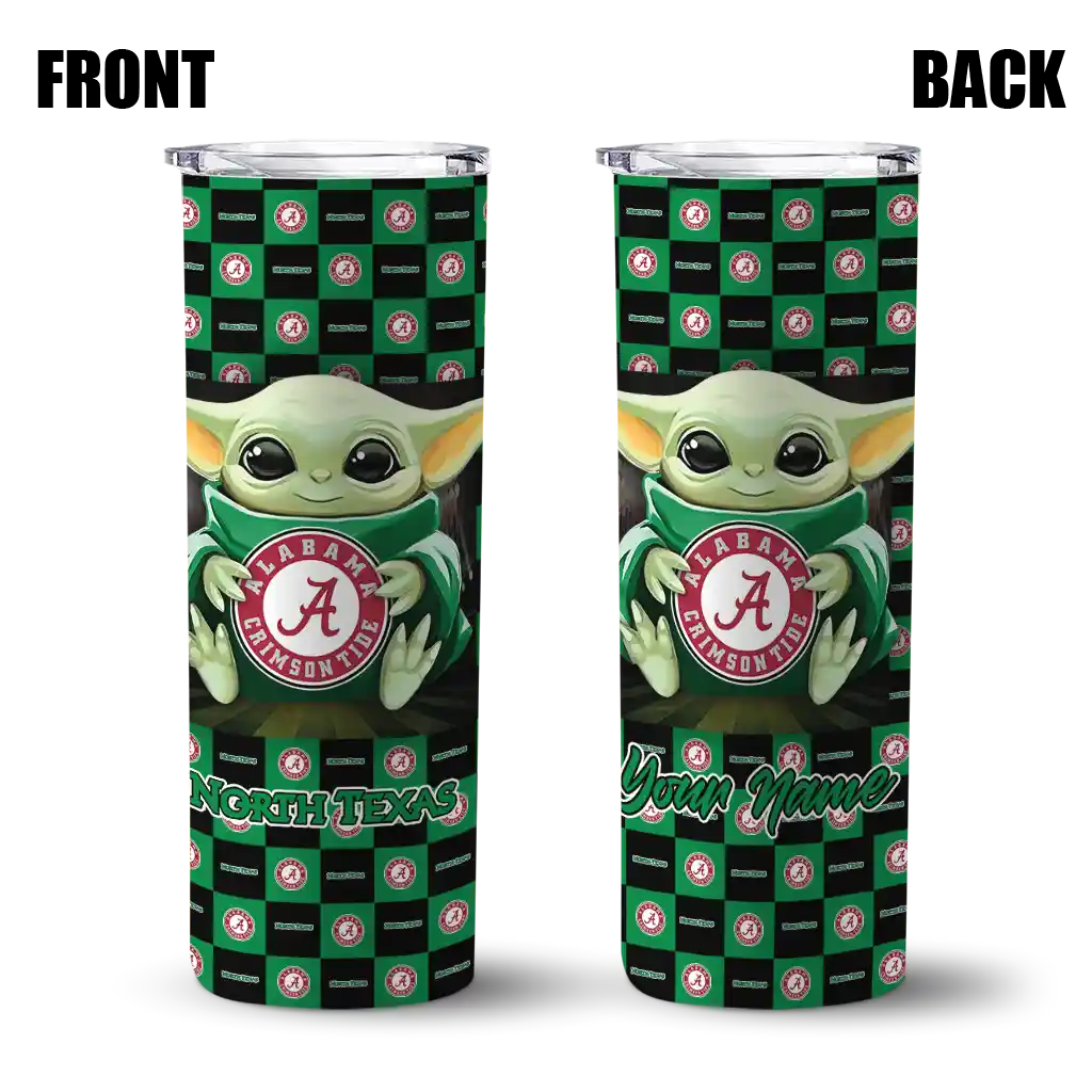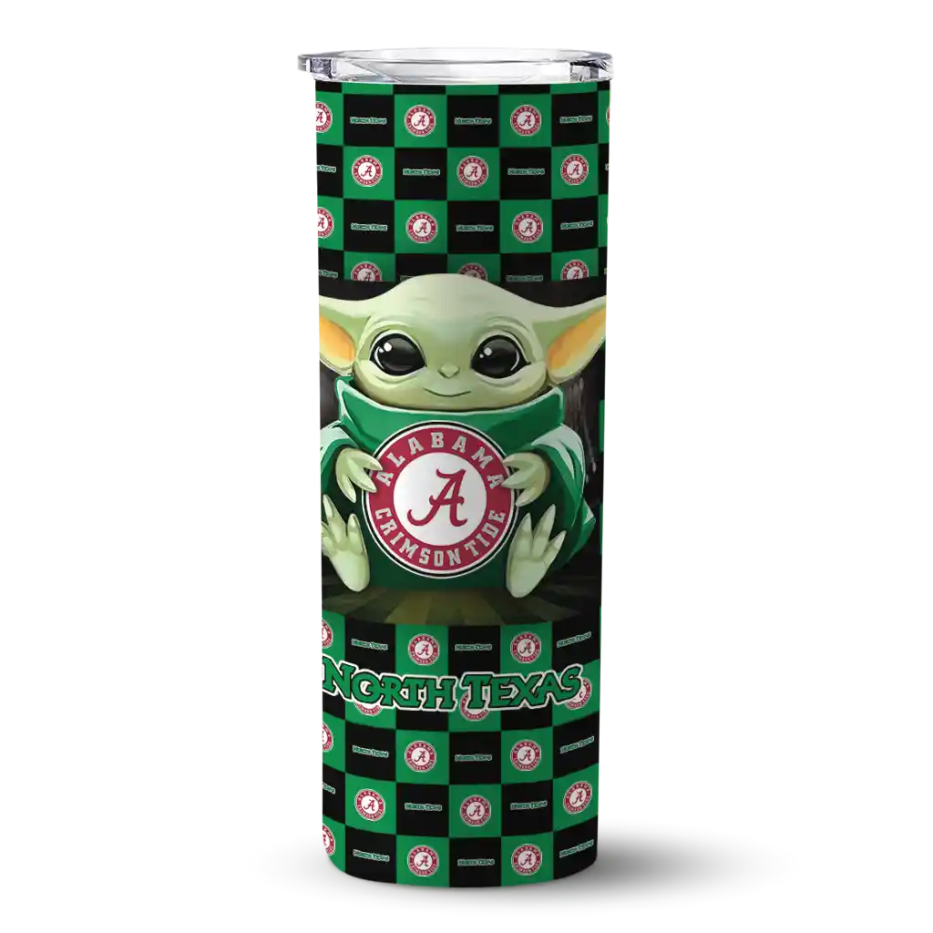 The Custom North Texas Mean Green Yoda Cozy Green Black Skinny Tumbler tumbler is the perfect way to stay refreshed while showing off your pride for North Texas Mean Green. With its double-wall insulation, your drinks stay at the right temperature for hours, whether you're enjoying a hot coffee or keeping your iced drink cold. What's inside? You’ll find 1 stainless steel tumbler, 1 clear lid, and 1 removable straw. It's the perfect blend of function and fan spirit! Ergonomically designed for comfort, made from durable stainless steel, and insulated to maintain your drink’s temperature, this tumbler is a must-have for any dedicated NCAA fan.