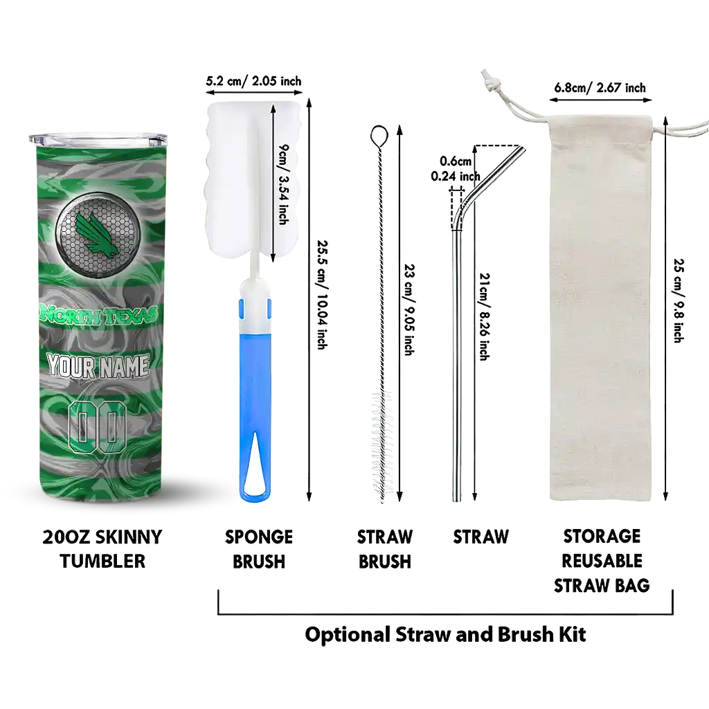 The Customized North Texas Mean Green Patterned Waves Green Skinny Tumbler tumbler is the perfect way to stay refreshed while showing off your pride for North Texas Mean Green. With its double-wall insulation, your drinks stay at the right temperature for hours, whether you're enjoying a hot coffee or keeping your iced drink cold. What's inside? You’ll find 1 stainless steel tumbler, 1 clear lid, and 1 removable straw. It's the perfect blend of function and fan spirit! Ergonomically designed for comfort, made from durable stainless steel, and insulated to maintain your drink’s temperature, this tumbler is a must-have for any dedicated NCAA fan.