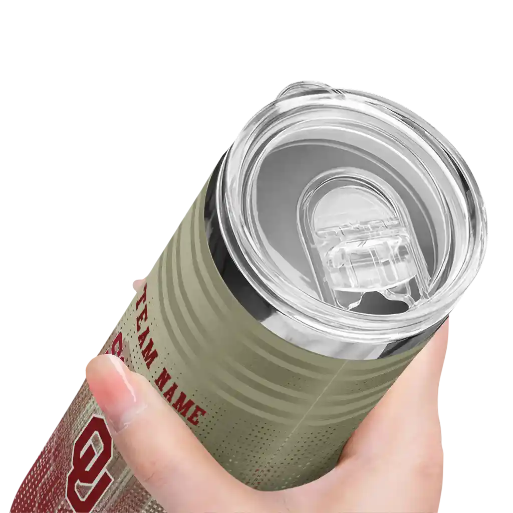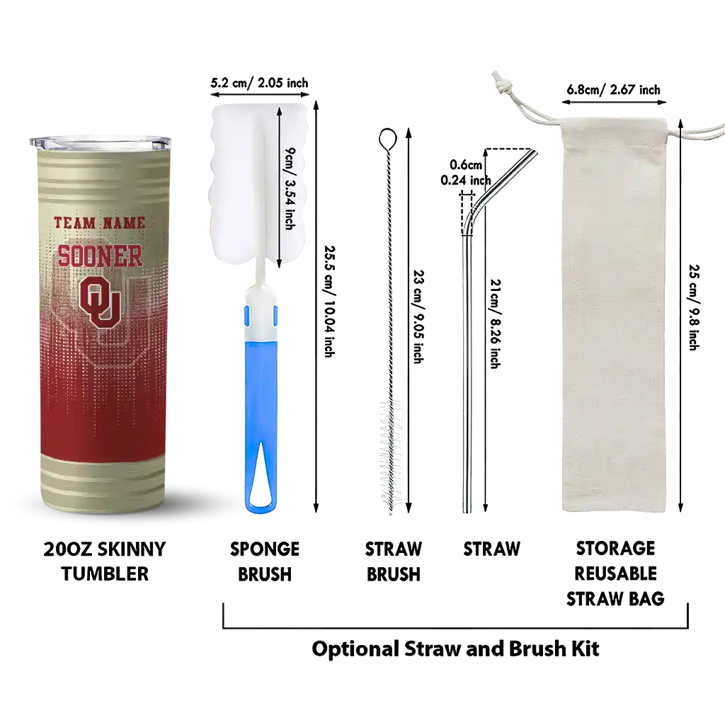 The Custom Oklahoma Sooners Chevron Patch Crimson Skinny Tumbler tumbler is the perfect way to stay refreshed while showing off your pride for Oklahoma Sooners. With its double-wall insulation, your drinks stay at the right temperature for hours, whether you're enjoying a hot coffee or keeping your iced drink cold. What's inside? You’ll find 1 stainless steel tumbler, 1 clear lid, and 1 removable straw. It's the perfect blend of function and fan spirit! Ergonomically designed for comfort, made from durable stainless steel, and insulated to maintain your drink’s temperature, this tumbler is a must-have for any dedicated NCAA fan.