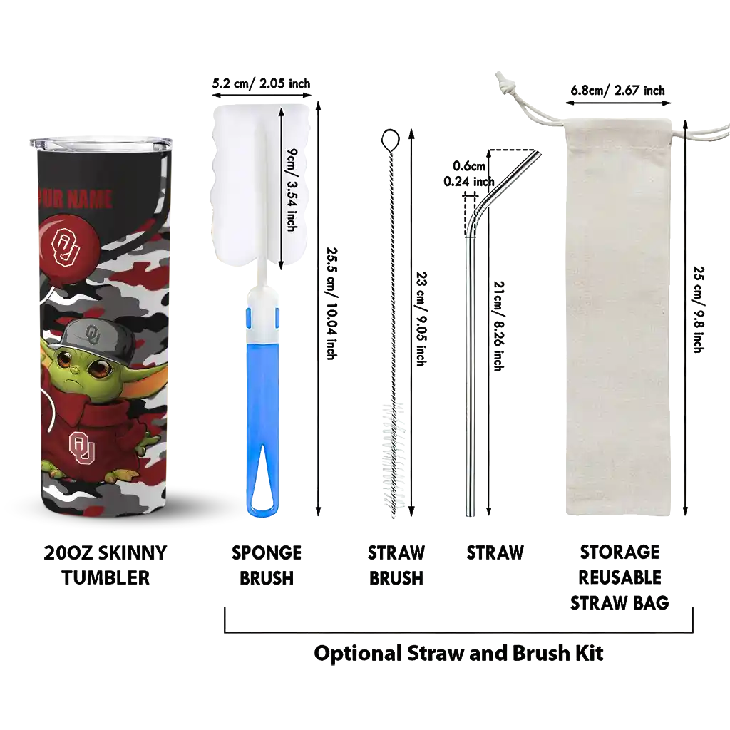 The Personalized Oklahoma Sooners Yoda Camo Crimson Black Skinny Tumbler tumbler is the perfect way to stay refreshed while showing off your pride for Oklahoma Sooners. With its double-wall insulation, your drinks stay at the right temperature for hours, whether you're enjoying a hot coffee or keeping your iced drink cold. What's inside? You’ll find 1 stainless steel tumbler, 1 clear lid, and 1 removable straw. It's the perfect blend of function and fan spirit! Ergonomically designed for comfort, made from durable stainless steel, and insulated to maintain your drink’s temperature, this tumbler is a must-have for any dedicated NCAA fan.
