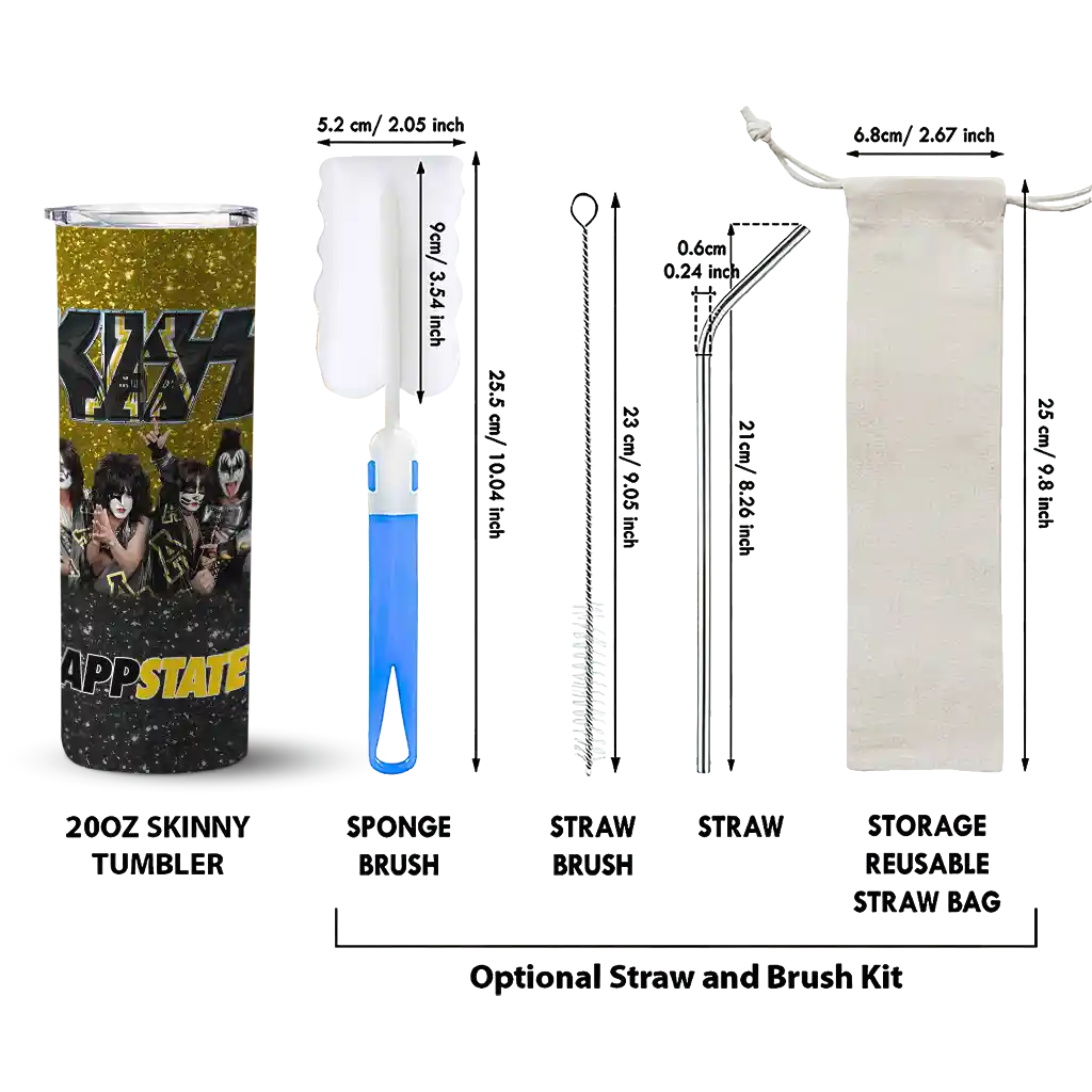The Custom Appalachian State Mountaineers Kiss Band Gold Skinny Tumbler tumbler is the perfect way to stay refreshed while showing off your pride for Appalachian State Mountaineers. With its double-wall insulation, your drinks stay at the right temperature for hours, whether you're enjoying a hot coffee or keeping your iced drink cold. What's inside? You’ll find 1 stainless steel tumbler, 1 clear lid, and 1 removable straw. It's the perfect blend of function and fan spirit! Ergonomically designed for comfort, made from durable stainless steel, and insulated to maintain your drink’s temperature, this tumbler is a must-have for any dedicated NCAA fan.