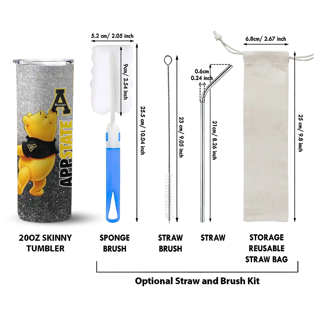 The Custom Appalachian State Mountaineers Winnie the Pooh Black Gray Skinny Tumbler tumbler is the perfect way to stay refreshed while showing off your pride for Appalachian State Mountaineers. With its double-wall insulation, your drinks stay at the right temperature for hours, whether you're enjoying a hot coffee or keeping your iced drink cold. What's inside? You’ll find 1 stainless steel tumbler, 1 clear lid, and 1 removable straw. It's the perfect blend of function and fan spirit! Ergonomically designed for comfort, made from durable stainless steel, and insulated to maintain your drink’s temperature, this tumbler is a must-have for any dedicated NCAA fan.